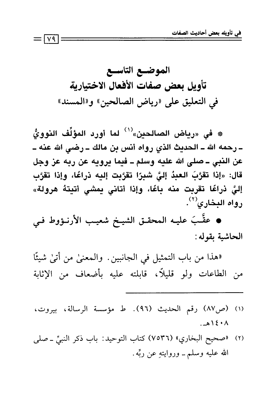 * في "رياض الصالحين" (¬1) لما أورد المؤلِّف النوويُّ - رحمه الله - الحديث الذي رواه أنس بن مالك -رضي الله عنه - عن النبي - صلى الله عليه وسلم - فيما يرويه عن ربه عَزَّ وَجَلَّ قال: "إذا تقربَ العبدُ إليَّ شبرًا تقرَّبت إليه ذراعًا، وإذا تقرَّب إلي ذراعًا تقربت منه باعًا، وإذا أتاني يمشي أتيتة هرولة"