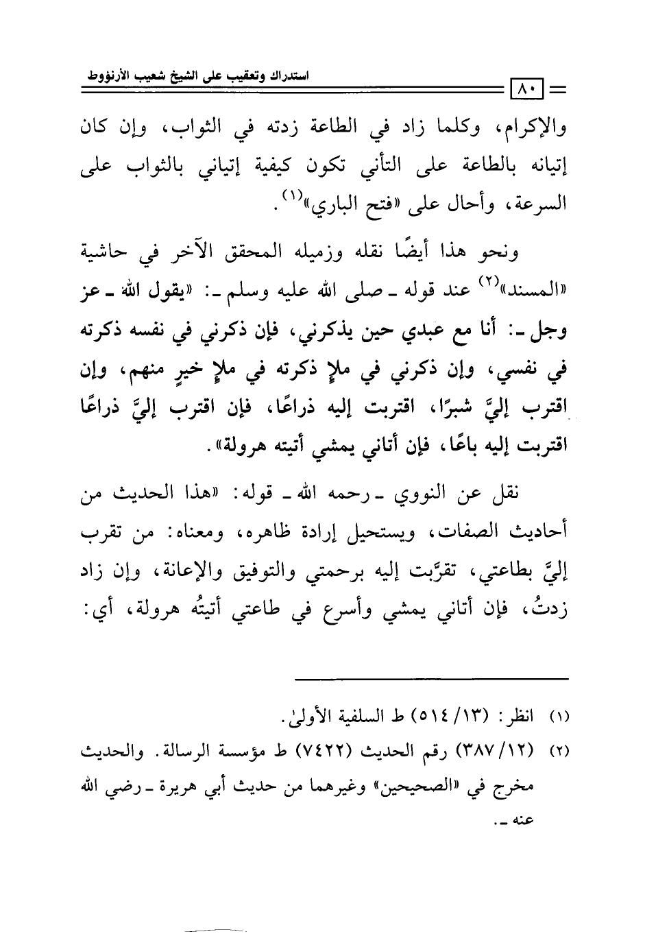 ونحو هذا أيضًا نقله وزميله المحقق الآخر في حاشية "المسند" (¬2) عند قوله - صلى الله عليه وسلم -: "يقول الله -عز وجل-: أنا مع عبدي حين يذكرني، فإن ذكرني في نفسه ذكرته في نفسي، وإن ذكرني في ملإٍ ذكرته في ملإٍ خيرٍ منهم، وإن اقترب إليَّ شبرًا، اقتربت إليه ذراعًا، فإن اقترب إليَّ ذراعًا اقتربت إليه باعًا، فإن أتاني يمشي أتيته هرولة".