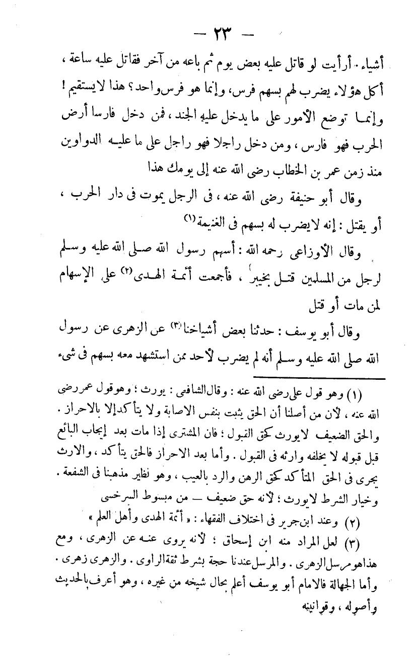 أَشْيَاءُ أَرَأَيْتَ لَوْ قَاتَلَ عَلَيْهِ بَعْضَ يَوْمٍ ثُمَّ بَاعَهُ مِنْ آخَرَ فَقَاتَلَ عَلَيْهِ سَاعَةً أَكُلُّ هَؤُلَاءِ يُضْرَبُ لَهُمْ بِسَهْمِ فَرَسٍ وَإِنَّمَا هُوَ فَرَسٌ وَاحِدٌ هَذَا لَا يَسْتَقِيمُ وَإِنَّمَا تُوضَعُ الْأُمُورُ عَلَى مَا يَدْخُلُ عَلَيْهِ الْجُنْدُ فَمَنْ دَخَلَ فَارِسًا أَرْضَ الْحَرْبِ فَهُوَ فَارِسٌ وَمَنْ دَخَلَ رَاجِلًا فَهُوَ رَاجِلٌ عَلَى مَا عَلَيهِ الدَّوَاوِينُ مُنْذُ زَمَنِ عُمَرَ بْنِ الْخَطَّابِ رَضِيَ اللَّهُ عَنْهُ إِلَى يَوْمِكَ هَذَا