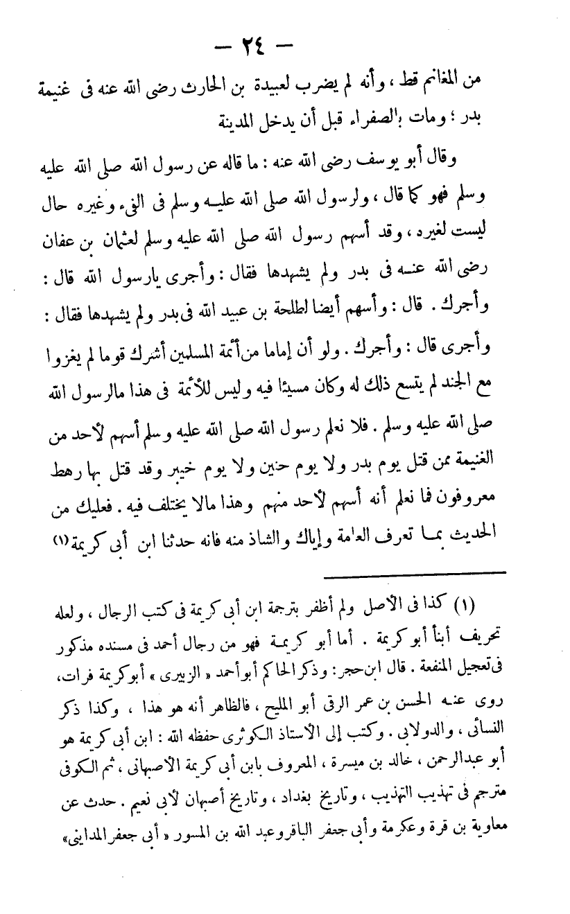 وَقَالَ أَبُو يُوسُفَ رَضِيَ اللَّهُ عَنْهُ مَا قَالَهُ عَنْ رَسُولِ اللَّهِ صَلَّى اللَّهُ عَلَيْهِ وَسَلَّمَ فَهُوَ كَمَا قَالَ وَلِرَسُولِ اللَّهِ صَلَّى الله عَلَيْهِ وَسلم فِي الفئ وَغَيْرِهِ حَالٌ لَيْسَتْ لِغَيْرِهِ وَقَدْ أَسْهَمَ رَسُولُ اللَّهُ صَلَّى اللَّهُ عَلَيْهِ وَسَلَّمَ لِعُثْمَانَ بْنِ عَفَّانَ رَضِيَ اللَّهُ عَنْهُ فِي بَدْرٍ وَلم يشهدها فَقَالَ وأجرى يارسول الله قَالَ وأجرك قَالَ وأسهم أَيْضًا لِطَلْحَةَ بْنِ عُبَيْدِ اللَّهِ فِي بَدْرٍ وَلَمْ يَشْهَدْهَا فَقَالَ وَأَجْرِي قَالَ وَأَجْرُكَ وَلَوْ أَنَّ إِمَامًا مِنْ أَئِمَّةِ الْمُسْلِمِينَ أَشْرَكَ قَوْمًا لَمْ يَغْزُوا مَعَ الْجُنْدِ لَمْ يَتَّسِعْ ذَلِكَ لَهُ وَكَانَ مُسِيئًا فِيهِ وَلَيْسَ لِلْأَئِمَّةِ فِي هَذَا مَا لِرَسُولِ اللَّهِ صَلَّى اللَّهُ عَلَيْهِ وَسَلَّمَ فَلَا نَعْلَمُ رَسُولُ اللَّهِ صَلَّى اللَّهُ عَلَيْهِ وَسَلَّمَ أَسْهَمَ لِأَحَدٍ مِنَ الْغَنِيمَةِ مِمَّنْ قُتِلَ يَوْمَ بَدْرٍ وَلَا يَوْمَ حُنَيْنٍ وَلَا يَوْمَ خَيْبَرَ وَقَدْ قُتِلَ بِهَا رَهْطٌ مَعْرُوفُونَ فَمَا نَعْلَمُ أَنَّهُ أَسْهَمَ لِأَحَدٍ مِنْهُم وَهَذَا مَا لَا يَخْتَلِفُ فِيهِ فَعَلَيْكَ مِنَ الْحَدِيثِ بِمَا تَعْرِفُ الْعَامَّةُ وَإِيَّاكَ وَالشَّاذَّ مِنْهُ فَإِنَّهُ حَدَّثَنَا ابنُ أَبِي كَرِيمَة