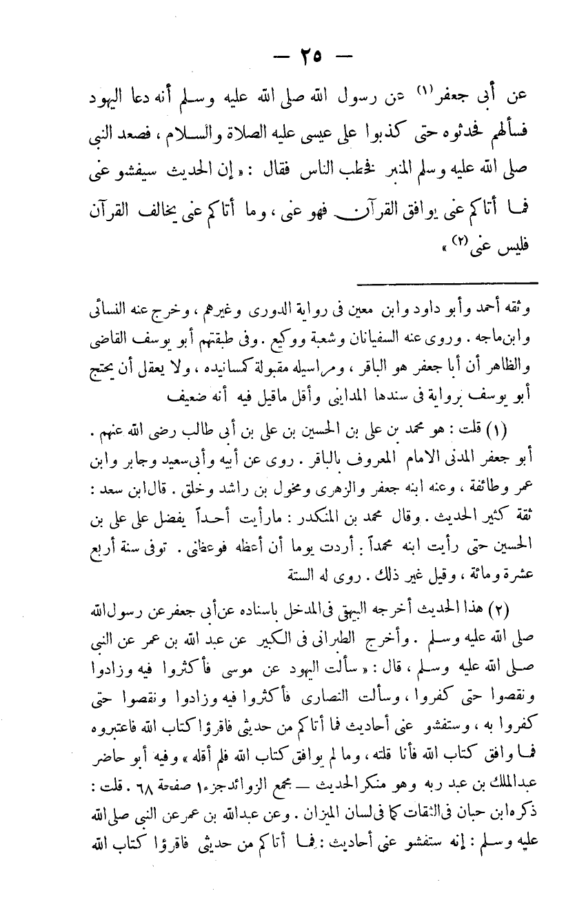 عَنْ أَبِي جَعْفَرٍ عَنْ رَسُولِ اللَّهِ صَلَّى اللَّهُ عَلَيْهِ وَسَلَّمَ أَنَّهُ دَعَا الْيَهُودَ فَسَأَلَهُمْ فَحَدَّثُوهُ حَتَّى كَذَبُوا عَلَى عِيسَى عَلَيْهِ الصَّلَاةُ وَالسَّلَامُ فَصَعِدَ النَّبِيُّ صَلَّى اللَّهُ عَلَيْهِ وَسَلَّمَ الْمِنْبَرَ فَخَطَبَ النَّاس فَقَالَ إِن الحَدِيث سيشفو عَنِّي فَمَا أَتَاكُمْ عَنِّي يُوَافِقُ الْقُرْآنَ فَهُوَ عَنِّي وَمَا أَتَاكُمْ عَنِّي يُخَالِفُ الْقُرْآنَ فَلَيْسَ عَنِّي