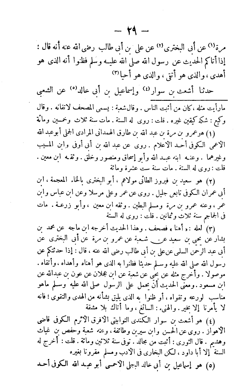 مرّة عَن أبي البحتري عَنْ عَلَيِّ بْنِ أَبِي طَالِبٍ رَضِيَ اللَّهُ عَنْهُ أَنَّهُ قَالَ إِذَا أَتَاكُمُ الْحَدِيثُ عَنْ رَسُولِ اللَّهِ صَلَّى اللَّهُ عَلَيْهِ وَسَلَّمَ فَظُنُّوا أَنَّهُ الَّذِي هُوَ أَهْدَى وَالَّذِي وَهُوَ أَتْقَى وَالَّذِي هُوَ أَحْيَا