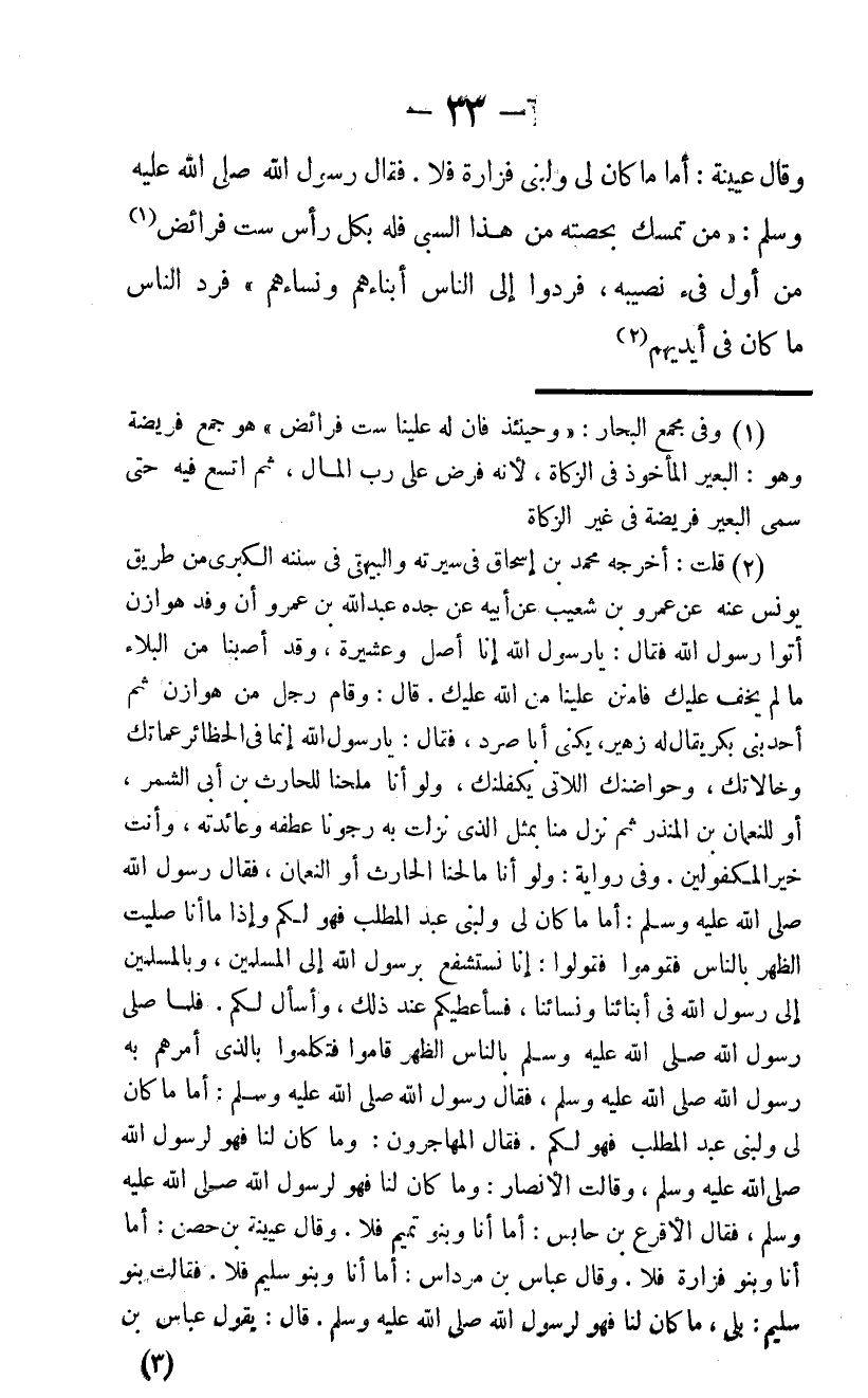 وَقَالَ عُيَيْنَةُ أَمَّا مَا كَانَ لِي وَلِبَنِي فَزَارَةَ فَلَا فَقَالَ رَسُولُ اللَّهِ صَلَّى اللَّهُ عَلَيْهِ وَسَلَّمَ مَنْ تَمَسَّكَ بِحِصَّتِهِ مِنْ هَذَا السَّبْيِ فَلَهُ بِكُلِّ رَأْسٍ سِتُّ فَرَائِضَ مِنْ أَوَّلِ فَيْءٍ نَصِيبَهُ فَرُدُّوا إِلَى النَّاسِ أَبْنَاءَهُمْ وَنِسَاءَهُمْ فَرَدَّ النَّاسُ مَا كَانَ فِي أَيْديهم
