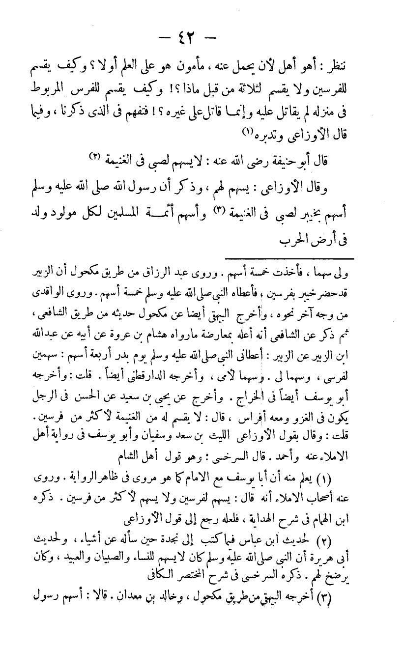 نَنْظُرَ أَهُوَ أَهْلٌ لأَنْ يُحْمَلَ عَنْهُ مَأْمُونٌ هُوَ عَلَى الْعِلْمِ أَولا وَكَيْفَ يُقَسِّمُ لِلْفَرَسَيْنِ وَلَا يُقَسِّمُ لِثَلَاثَةٍ مِنْ قِبَلِ مَاذَا وَكَيْفَ يُقَسِّمُ لِلْفَرَسِ الْمَرْبُوطِ فِي مَنْزِلِهِ لَمْ يُقَاتِلْ عَلَيْهِ وَإِنَّمَا قَاتَلَ عَلَى غَيْرِهِ فَتَفَهَّمْ فِي الَّذِي ذَكَرْنَا وَفِيمَا قَالَ الْأَوْزَاعِيُّ وَتَدَبَّرَهُ