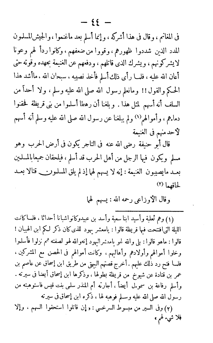 فِي الْمَغَانِم وَقَالَ فِي هَذَا أَشْرَكَهُ وَإِنَّمَا أَسْلَمَ بَعْدَ ماغنموا وَالْجَيْشُ الْمُسْلِمُونَ الْمَدَدُ الَّذِينَ شَدَّدُوا ظُهُورَهُمْ وَقَوَّوْا مِنْ ضَعْفِهِمْ وَكَانُوا رِدْأً لَهُمْ وَعَوْنًا لَا يُشْرِكُونَهُمْ وَيُشْرَكُ الَّذِي قَاتَلَهُمْ وَدَفَعَهُمْ عَنِ الْغَنِيمَةِ بِجُهْدِهِ وَقُوَّتِهِ حَتَّى أَعَانَ اللَّهُ عَلَيْهِ فَلَمَّا رَأَى ذَلِكَ أَسْلَمَ فَأَخَذَ نَصِيَبَهُ سُبْحَانَ اللَّهِ مَا أَشَدَّ هَذَا الْحُكْمَ وَالْقَوْلَ وَمَا نَعْلَمُ رَسُولَ اللَّهِ صَلَّى اللَّهُ عَلَيْهِ وَسَلَّمَ وَلَا أَحَدًا مِنَ السَّلَفِ أَنَّهُ أَسْهَمَ لِمِثْلِ هَذَا وَبَلَغَنَا أَنَّ رَهْطًا أَسْلَمُوا مِنْ بَنِي قُرَيْظَةَ فَحَقَنُوا دِمَاءَهُمْ وَأَمْوَالَهُمْ وَلَمْ يَبْلُغْنَا عَنْ رَسُولِ اللَّهِ صَلَّى اللَّهُ عَلَيْهِ وَسَلَّمَ أَنَّهُ أَسْهَمَ لِأَحَدٍ مِنْهُمْ فِي الْغَنِيمَةِ