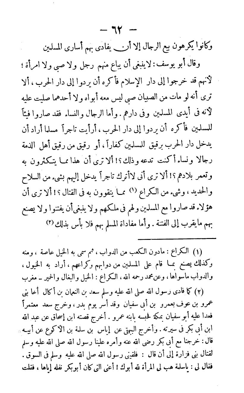 وَقَالَ أَبُو يُوسُفَ لَا يَنْبَغِي أَنْ يُبَاعَ مِنْهُمْ رَجُلٌ وَلَا صَبِيٌّ وَلَا امْرَأَةٌ لِأَنَّهُمْ قَدْ خَرَجُوا إِلَى دَارِ الْإِسْلَامِ فَأَكْرَهُ أَنْ يُرَدُّوا إِلَى دَارِ الْحَرْبِ أَلَا تَرَى أَنَّهُ لَوْ مَاتَ مِنَ الصِّبْيَانِ صَبِيٌّ لَيْسَ مَعَهُ أَبَوَاهُ وَلَا أَحَدُهُمَا صَلَّيْتَ عَلَيْهِ لِأَنَّهُ فِي أَيْدِي الْمُسْلِمِينَ وَفِي دَارِهِمْ وَأَمَّا الرِّجَالُ وَالنِّسَاءُ فَقَدْ صَارُوا فَيْئًا لِلْمُسْلِمِينَ فَأَكْرَهُ أَنْ يُرَدُّوا إِلَى دَارِ الْحَرْبِ أَرَأَيْتَ تَاجِرًا مُسْلِمًا أَرَادَ أَنْ يَدْخُلَ دَارِ الْحَرْبِ بِرَقِيقٍ لِلْمُسْلِمِينَ كُفَّارًا أَوْ رَقِيقٍ مِنْ رَقِيقِ أَهْلِ الذِّمَّة رجَالًا ونساءا أَكُنْتَ تَدَعُهُ وَذَلِكَ أَلَا تَرَى أَنَّ هَذَا مِمَّا يَتَكَثَّرُونَ بِهِ وَتُعَمَّرُ بِلادُهُمْ أَلَا تَرَى أَنِّي لَا أَتْرُكُ تَاجِرًا يَدْخُلُ إِلَيْهِمْ بِشَيْءٍ مِنَ السِّلاحِ وَالْحَدِيدِ وَشَيْءٍ مِنَ الْكُرَاعِ مِمَّا يَتَقَوَّوْنَ بِهِ فِي الْقِتَالِ أَلَا تَرَى أَنَّ هَؤُلَاءِ قَدْ صَارُوا مَعَ الْمُسْلِمِينَ وَلَهُمْ فِي مُلْكِهِمْ وَلَا يَنْبَغِي أَنْ يُفْتَنُوا وَلَا يُصْنَعُ بِهِمْ مَا يَقْرُبُ إِلَى الْفِتْنَةِ وَأَمَّا مُفَادَاةُ الْمُسْلِمِ بِهِمْ فَلَا بَأْسَ بذلك