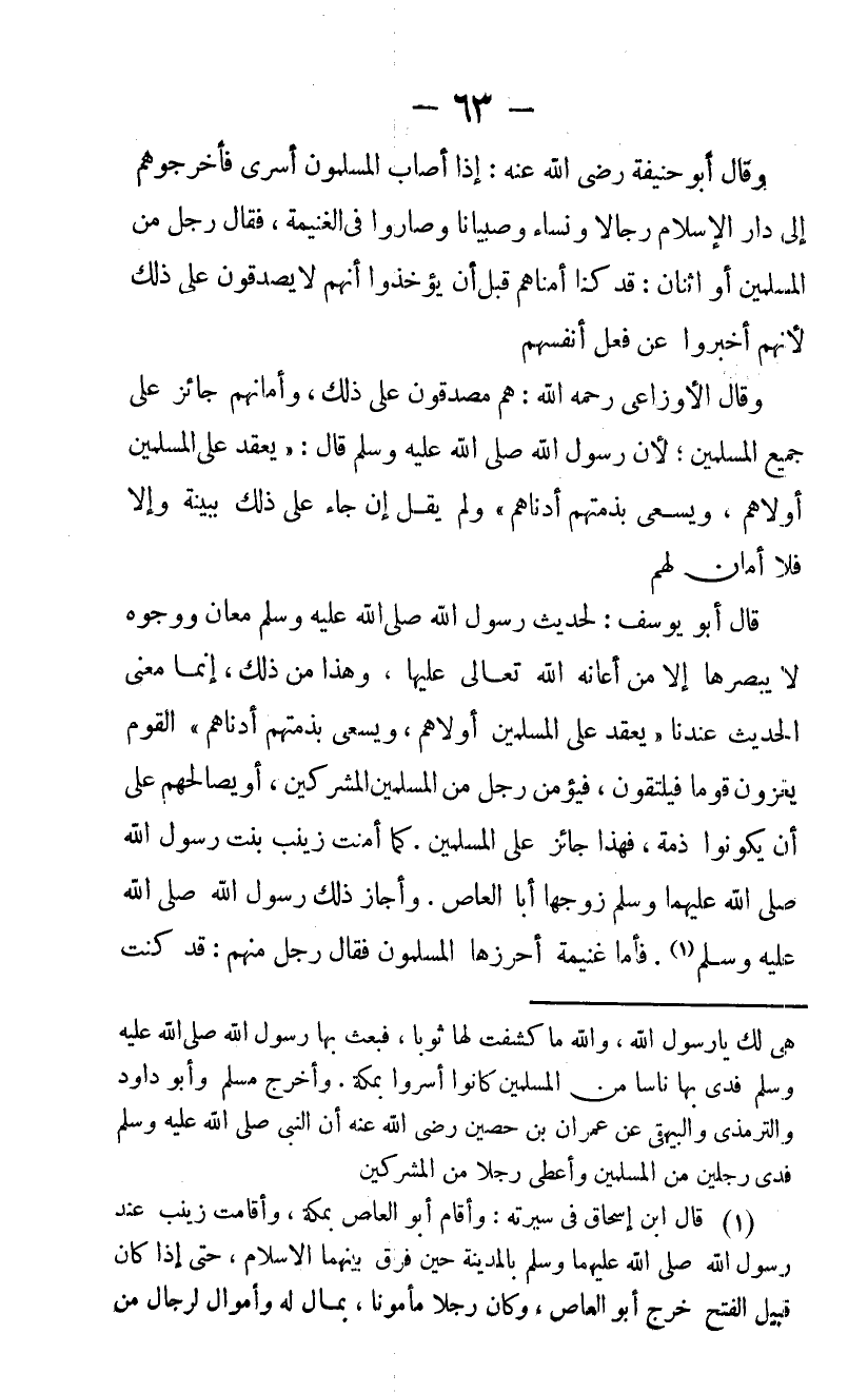 قَالَ أَبُو يُوسُفَ لِحَدِيثِ رَسُولِ اللَّهِ صَلَّى اللَّهُ عَلَيْهِ وَسَلَّمَ مَعَانٍ وَوُجُوهٌ لَا يُبْصِرُهَا إِلَّا مَنْ أَعَانَهُ اللَّهُ تَعَالَى عَلَيْهَا وَهَذَا مِنْ ذَلِكَ إِنَّمَا مَعْنَى الْحَدِيثِ عِنْدَنَا يَعْقِدُ عَلَى الْمُسْلِمِينَ أولاهم وَيسْعَى بذمتم أَدْنَاهُمْ الْقَوْمُ يَغْزُونَ قَوْمًا فَيَلْتَقُونَ فَيُؤَمِّنُ رَجُلٌ مِنَ الْمُسْلِمِينَ الْمُشْرِكِينَ أَوْ يُصَالِحُهُمْ عَلَى أَنْ يَكُونُوا ذِمَّةً فَهَذَا جَائِزٌ عَلَى الْمُسْلِمِينَ كَمَا أَمَّنَتْ زَيْنَبُ بِنْتُ رَسُولِ اللَّهِ صَلَّى اللَّهُ عَلَيْهِ وَسَلَّمَ زَوْجَهَا أَبَا الْعَاصِ وَأَجَازَ ذَلِكَ رَسُولُ اللَّهِ صَلَّى اللَّهُ عَلَيْهِ وَسَلَّمَ فَأَمَّا غَنِيمَةٌ أَحْرَزَهَا الْمُسْلِمُونَ فَقَالَ رَجُلٌ مِنْهُمْ قَدْ كُنْتُ