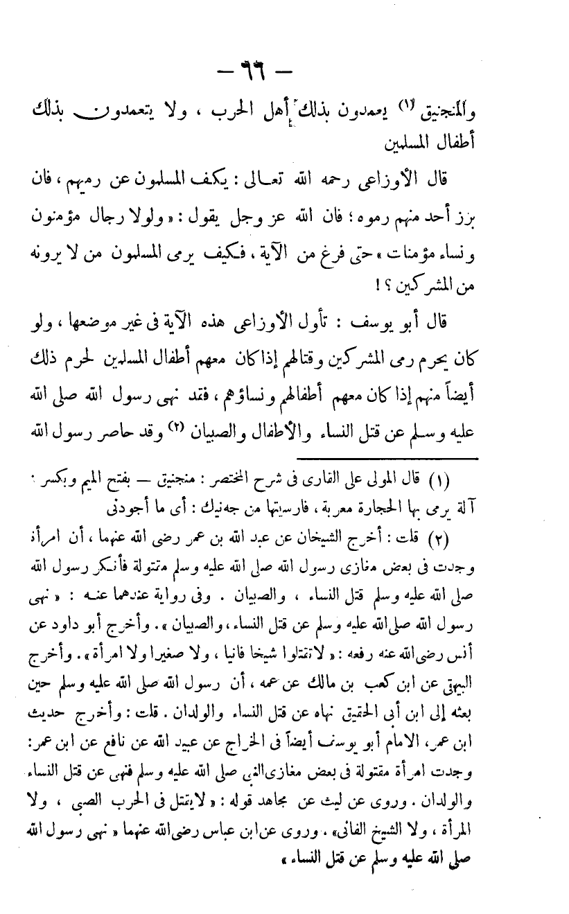 وَالْمَنْجَنِيقِ يَعْمِدُونَ بِذَلِكَ أَهْلَ الْحَرْبِ وَلَا يَتَعَمَّدُونَ بِذَلِكَ أَطْفَالَ الْمُسْلِمِينَ