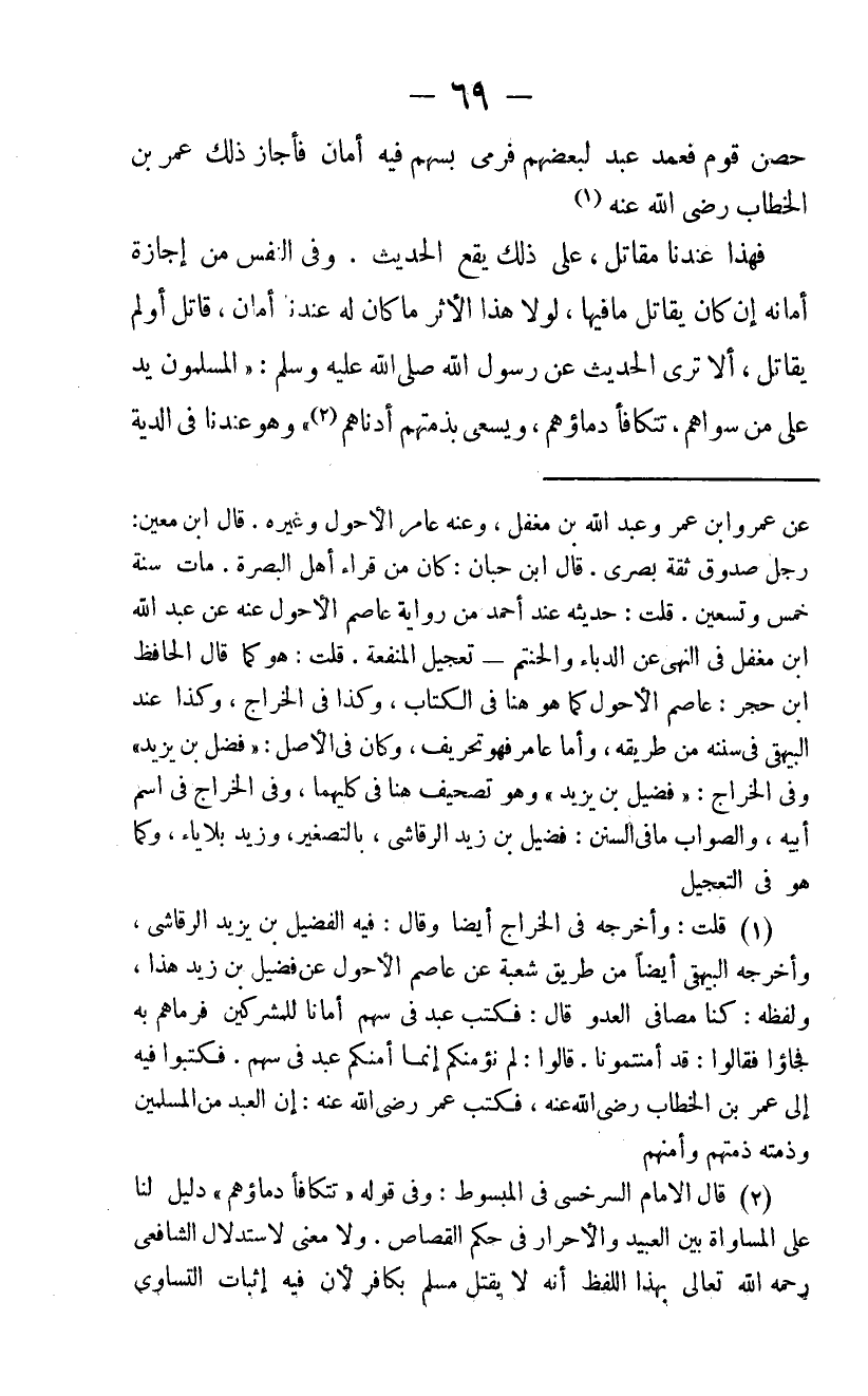 فَهَذَا عِنْدَنَا مُقَاتِلٌ عَلَى ذَلِكَ يَقَعُ الْحَدِيثُ وَفِي النَّفْسِ مِنْ إِجَازَةِ أَمَانِهِ إِنْ كَانَ يُقَاتِلُ مَا فِيهَا لَوْلَا هَذَا الأَثَرُ مَا كَانَ لَهُ عِنْدَنَا أَمَانٌ قَاتَلَ أَوْ لَمْ يُقَاتِلْ أَلَا تَرَى الْحَدِيثَ عَنْ رَسُولُ اللَّهِ صَلَّى اللَّهُ عَلَيْهِ وَسَلَّمَ الْمُسْلِمُونَ يَدٌ عَلَى مَنْ سِوَاهُمْ تَتَكَافَأُ دِمَاؤُهُمْ وَيَسْعَى بِذِمَّتِهِمْ أَدْنَاهُمْ وَهُوَ عِنْدَنَا فِي الدِّيَةِ