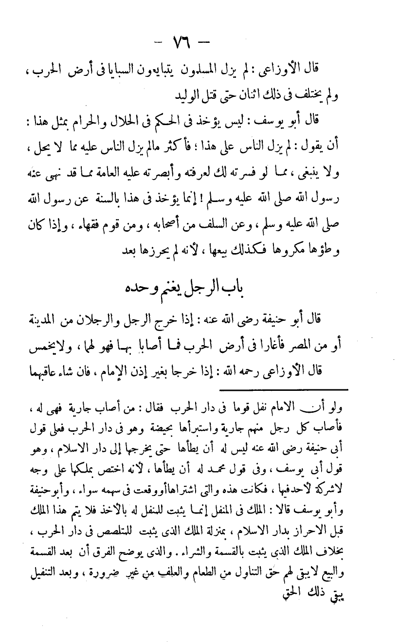 قَالَ الْأَوْزَاعِيُّ لَمْ يَزَلِ الْمُسْلِمَونَ يَتَبَايَعُونَ السَّبَايَا فِي أَرْضِ الْحَرْبِ وَلَمْ يَخْتَلِفْ فِي ذَلِكَ اثْنَانِ حَتَّى قُتِلَ الْوَلِيدُ