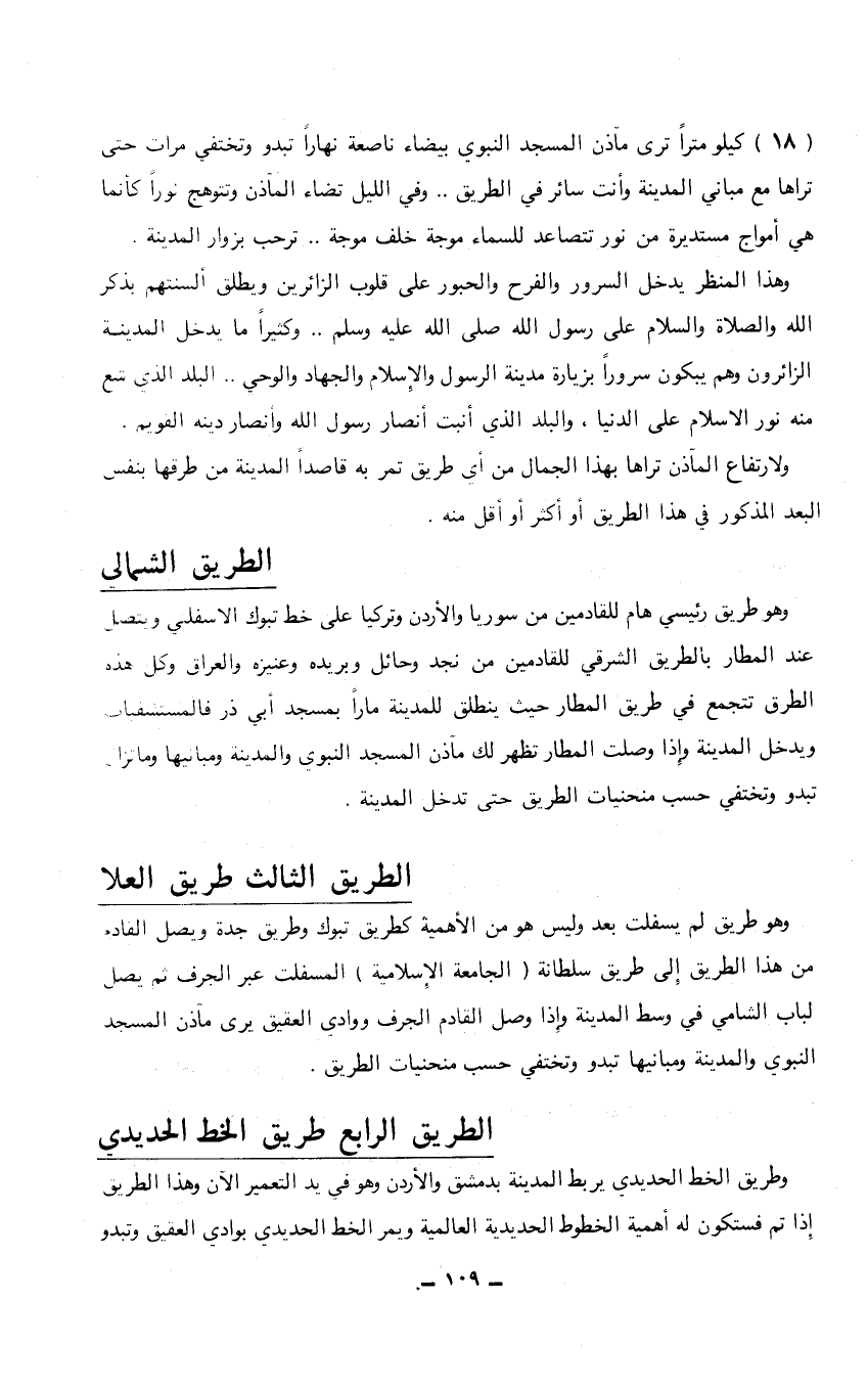 (18) كيلومتراً ترى مآذن المسجد النبوي بيضاء ناصعة نهاراً تبدو وتختفي مرات حتى تراها مع مباني المدينة وأنت سائر في الطريق ... وفي الليل تضاء المآذن وتتوهج نوراً كأنما هي أمواج مستديرة من نور تتصاعد للسماء موجة خلف موجة ... ترحب بزوار المدينة.