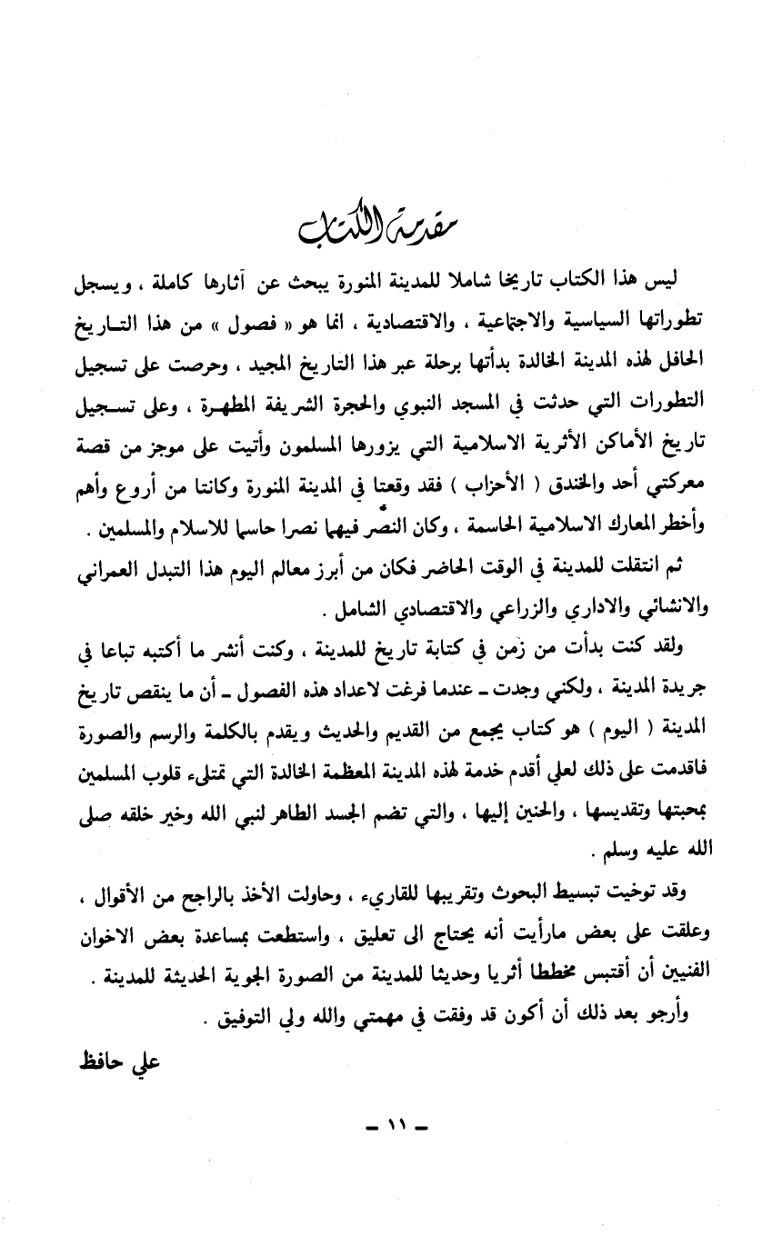 ولقد كنت بدأت من زمن في كتابة تاريخ للمدينة، وكنت أنشر ما أكتبه تباعاً في جريدة المدينة. ولكني وجدت- عندما فرغت لأعداد هذه الفصول- أن ما ينقص تاريخ المدينة (اليوم) هو كتاب يجمع من القديم والحديث ويقدم بالكلمة والرسم والصورة فأقدمت على ذلك لعلي أقدم خدمة لهذه المدينة المعظمة الخالدة التي تمتلئ قلوب المسلمين بمحبتها وتقديسها، والحنين إليها، والتي تضم الجسد الطاهر لنبي الله وخير خلقه صلى الله عليه وسلم.