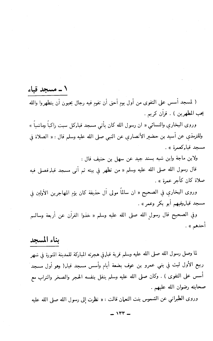 (المسجد أسس على التقوى من أول يوم أحق أن تقوم فيه رجال يحبون أن يتطهروا والله يحب المطهرين). قرآن كريم. وروى البخاري والنسائي "أن رسول الله كان يأتي مسجد قباء كل سبت راكباً وماشياً" وللترمذي عن أسيد بن حضير الأنصاري عن النبي صلى الله عليه وسلم قال: "الصلاة في مسجد قباء كعمرة". ولابن ماجة وابن شبه بسند جيد عن سهل بن حنيف قال: قال رسول الله صلى الله عليه وسلم " من تطهر في بيته ثم أتى مسجد قباء فصلى فيه صلاة كان كأجر عمر". وروى البخاري في الصحيح " أن سالماً مولى آل حذيفة كان يوم المهاجرين الأولين في مسجد قباء وفيهم أبو بكر وعمر". وفي الصحيح قال رسول الله صلى الله عليه وسلم "خذوا القرآن عن أربعة وسالم أحدهم".