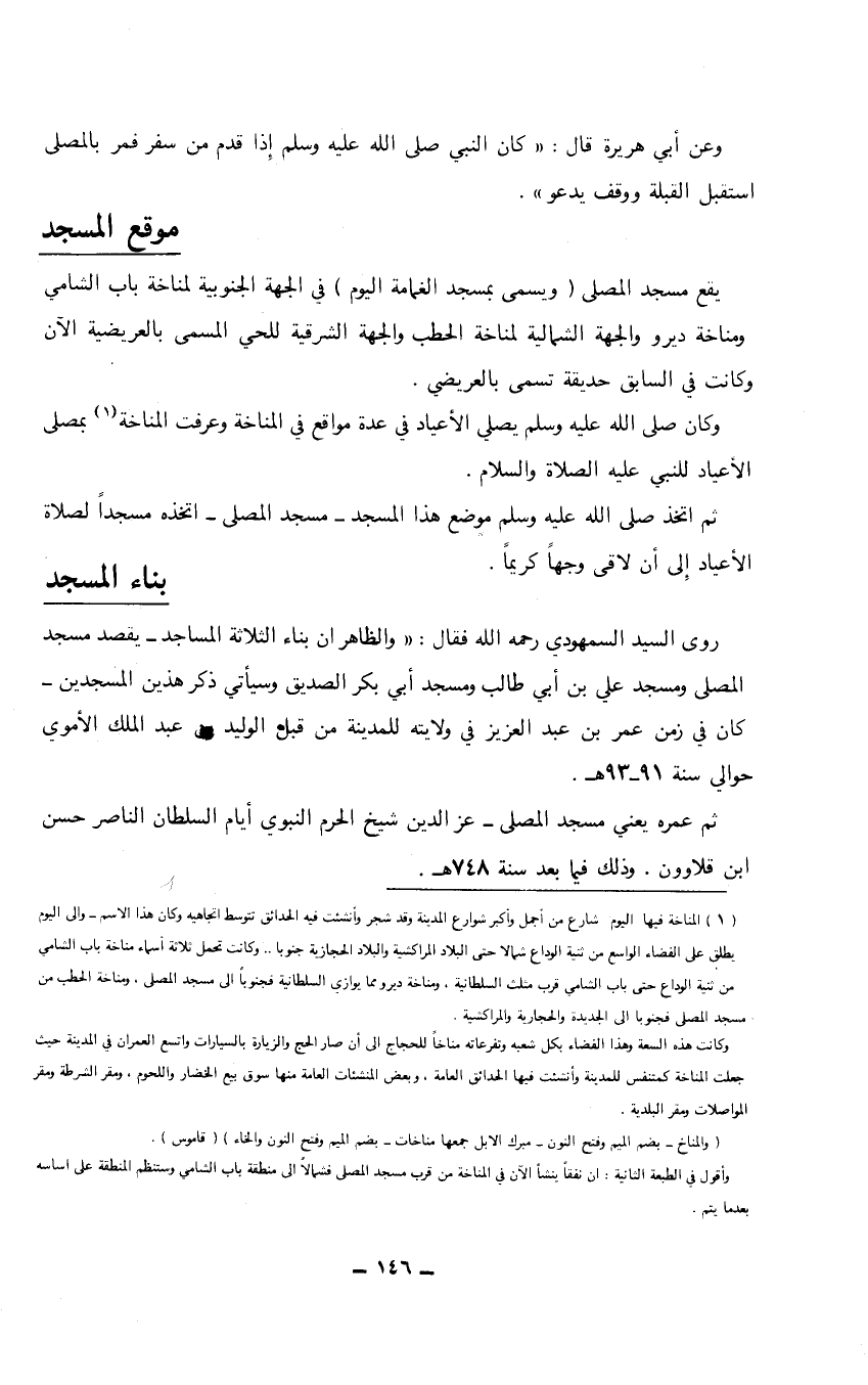 (1) المناخة فيها اليوم شارع من أجمل وأكبر شوارع وقد شجر وأنشئت فيه الحدائق تتوسط اتجاهية وكان هذا الاسم- وإلى اليوم يطلق على الفضاء الواسع من ثنية الوداع شمالاً حتى البلاد المراكشية والبلاد الحجازية جنوباً .. وكانت تحمل ثلاثة أسماء مناخة باب الشامي من ثنية الوداع حتىباب الشامي قرب مثلث السلطانية. ومناخة دير مما يوازي السلطانية فجنوباً إلى مسجد المصلى، ومناخة الحطب من مسجد المصلى فجنوباً إلى الجديدة والحجارية والمراكشية.