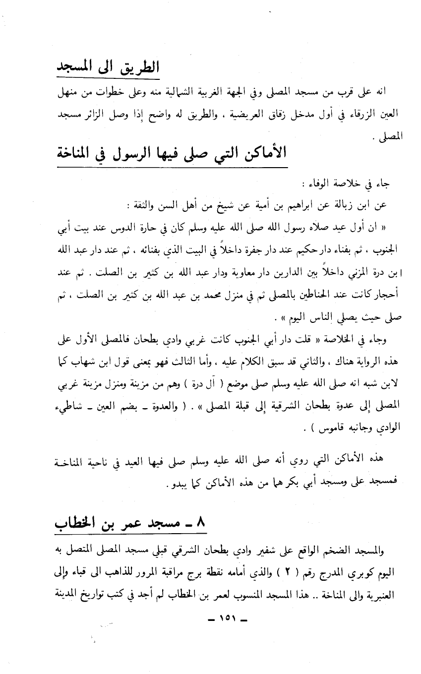 "إن أول عيد صلاه رسول الله صلى الله عليه وسلم كان في حارة الدوس عند بيت أبي الجنوب، ثم بفناء دار حكيم عند دار جفرة داخلاً في البيت الذي بفنائه، ثم عند دار عبدالله ابن درة المزني داخلاً بين الدارين دار معاوية ودار عبدالله بن كثير بن الصلت. ثم عند أحجار كانت عند الحناطين بالمصلى ثم في منزل محمد بن عبدالله بن كثير بن الصلت، ثم صلى حيث يصلي الناس اليوم".