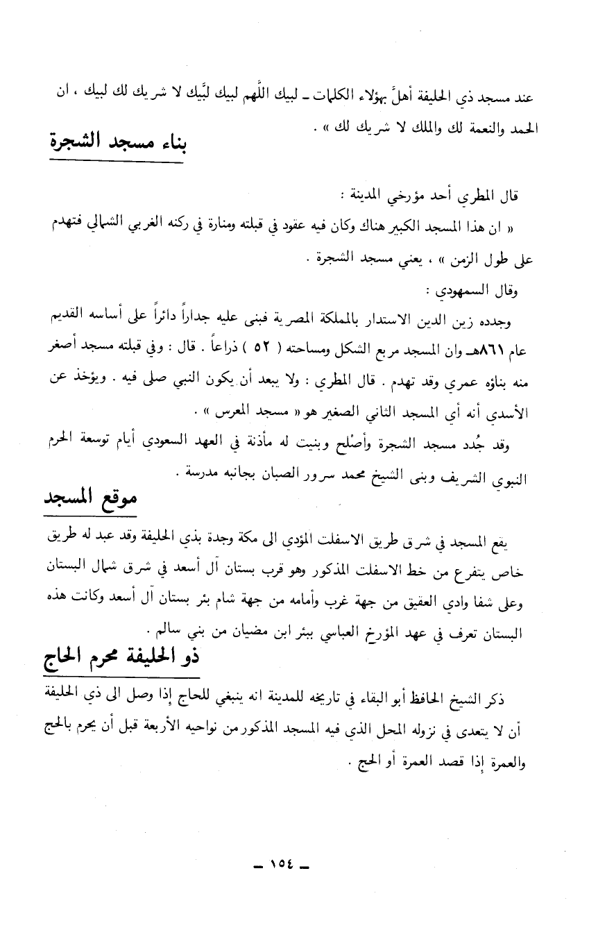 ذكر الشيخ الحافظ أبو البقاء في تاريخه للمدينة أنه ينبغي للحاج إذا وصل إلى ذي الحليفة أن لا يتعدى في نزوله المحل الذي فيه المسجد المذكور من نواحيه الأربعة قبل أن يحرم بالحج والعمرة إذا قصد العمرة أو الحج.…