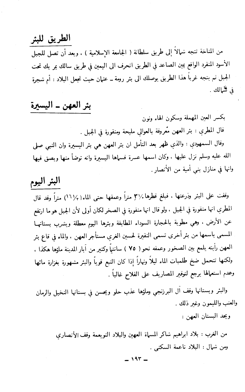 وقفت على البئر وذرعتها، فبلغ قطرها 1/ 2 3 متراً وعمقها حتى الماء (1/ 2 16) متراً وقد قال المطري أنها منقورة في الجبل، ولو قال إنها منقورة في الصخر لكان أولى لأن الجبل هو ما ارتفع عن الأرض، وهي مطوية بالحجارة السوداء المطابقة وبئرها اليوم معطلة ويشرب بستانها المسمى باسمها من بئر أخرى تسمى النقيرة لحسين الغري مستأجر العهن، والماء في قاع بئر العهن رأيته يلمع بين الصخور وعمقه نحو (75) سانتيماً وكثير من آبار المدينة ماؤها هكذا، ولكنها تتحمل ضخ طلمبات الماء ليلاً ونهاراً إذا كان النبع قوياً والبئر مشهورة بغزارة مائها وعدم استعمالها يرجع لتوفير المصاريف على الفلاح غالباً.