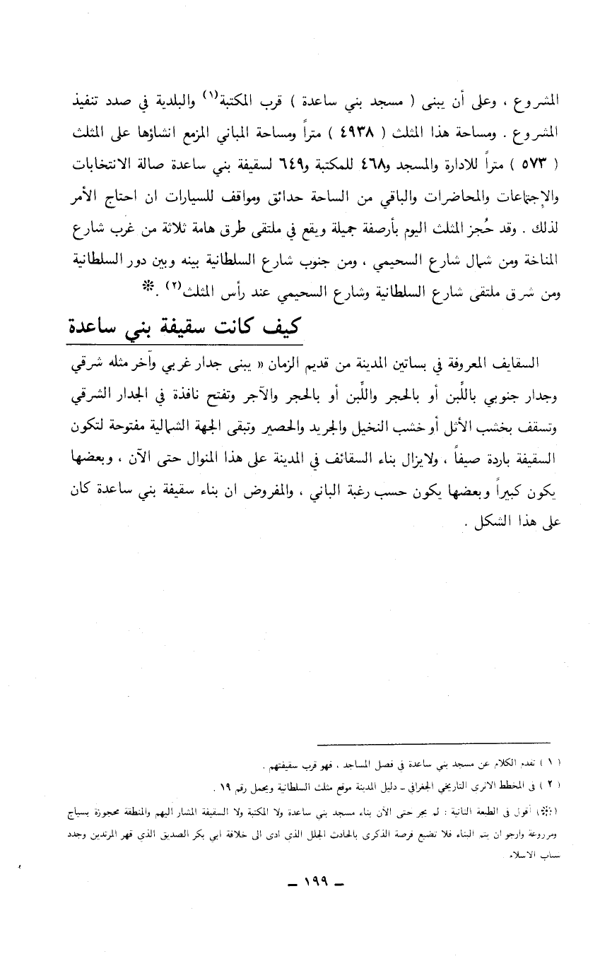 (*) أقول في الطبعة الثانية: لم يجر حتى الآن بناء مسجد بني ساعدة ولا المكتبة ولا السقيفة المشار إليهم والمنطقة محجوزة بسياج ومزروعة وارجو أن يتم البناء فلا تضيع فرصة الذكرى بالحادث الجلل الذي أدى إلى خلافة أبي بكر الصديق الذي قهر المرتدين وجدد شباب الإسلام.