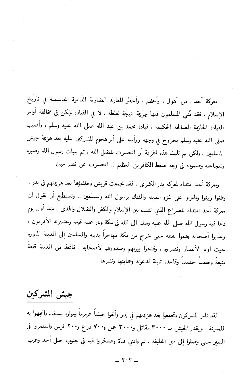 من أهول، وأعظم، وأخطر المعارك الضارية الدامية الحاسمة في تاريخ الإسلام، فقد مُني المسلمون فيها بهزيمة نتيجة لغلطة، لا في القيادة ولكن في مخالفة أوامر القيادة والحازمة الصالحة الحكيمة، قيادة محمد بن عبد الله صلى الله عليه وسلم، وأصيب صلى الله عليه وسلم بجروح في وجهه ورأسه على أثر هجوم المشركين عليه بعد هزيمة جيش المسلمين، ولكن لم تلبث هذه الهزيمة أن انحسرت بفضل الله، ثم بثبات رسول الله وصبره وشجاعته وصموده في وجه ضغط الكافرين العظيم ... انحسرت عن نصر مبين. ومعركة أحد امتداد لمعركة بدر الكبرى، فقد تجمعت قريش وحلفاؤها بعد هزيمتهم في بدر، وطغوا وبغوا وتآمروا على غزو المدينة والفتك برسول الله والمسلمين .. ونستطيع أن نقول أن معركة أحد امتداد للصراع الذي نشب بين الإسلام والكفر والضلال والهدى، منذ أول يوم دعا فيه رسول الله صلى الله عليه وسلم إلى الله في مكة وثار عليه قومه وعشيرته الأقربون، وعذبوا أصحابه وهموا بقتله حتى خرج من مكة مهاجراص بدينه والمسلمين إلى المدينة المنورة حيث آواه الأنصار ونصروه، وفتحوا بيوتهم وصدورهم لأصحابه، فاتخذ من المدينة قلعةُ منيعةً وحصناً حصيناً وقاعدة ثابتة لدعوته وحمايتها ونشرها.