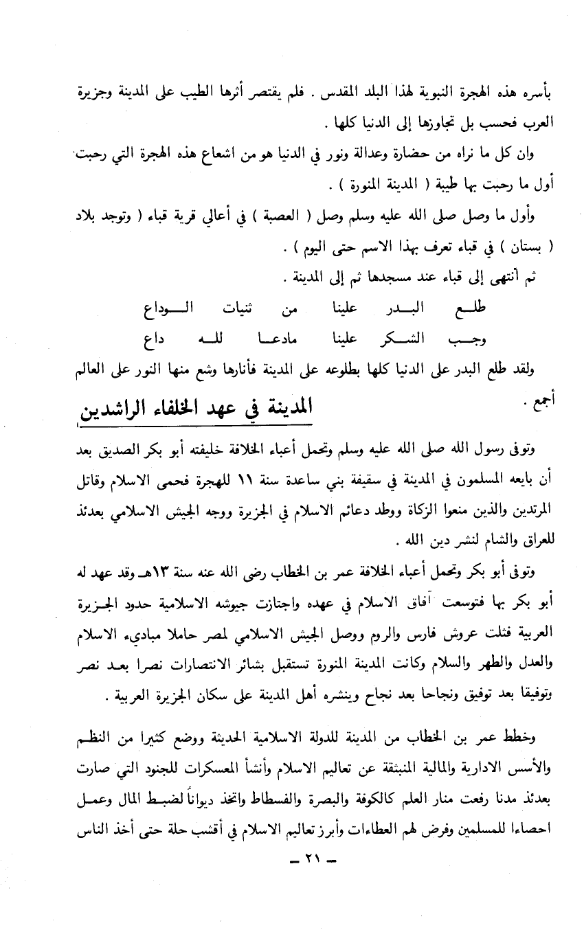 بأسره هذه الهجرة النبوية لهذا البلد المقدس. فلم يقتصرأثرها الطيب على المدينة وجزيرة العرب فحسب بل تجاوزها إلى الدنيا كلها. وإن كل ما نراه من حضارة وعدالة ونور في الدنيا هو من اشعاع هذه الهجرة التي رحبت أول ما رحبت بها طيبة (المدينة المنورة). وأول ما وصل صلى الله عليه وسلم وصل (العصبة) في أعالي قرية قباء (وتوجد بلاد (بستان) في قباء تعرف بهذا الاسم حتى اليوم). ثم انتهى إلى قباء عند مسجدها ثم إلى المدينة.