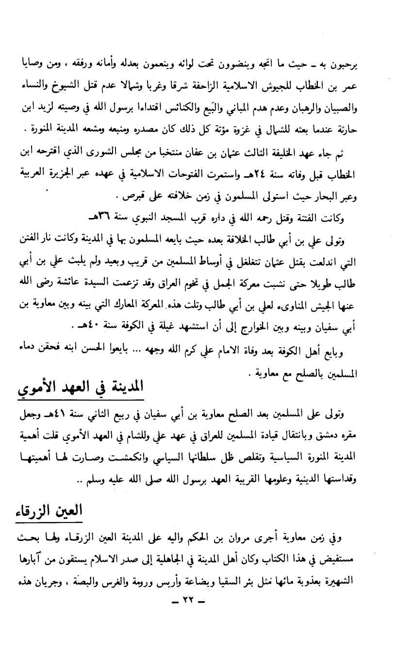 وفي زمن معاوية أجرى مروان بن الحكم وإليه على المدينة العين الزرقاء ولها بحث مستفيض في هذا الكتاب وكان أهل المدينة في الجاهلية إلى صدر الإسلام يستقون من آبارها الشهيرة بعذوبة مائها مثل بئر السقيا وبضاعة وأريس ورومة والغرس والبصة. وجريان هذه…