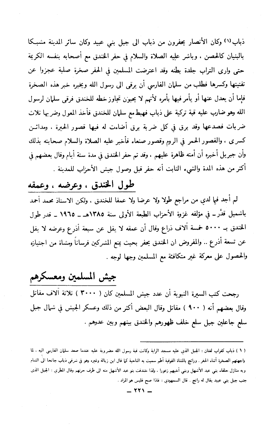 ذباب (1) وكان الأنصار يحفرون من ذباب إلى جبل بني عبيد وكان سائر المدينة مشبكا بالبنيان كالحصن، وباشر عليه الصلاة والسلام في حفر الخندق مع أصحابه بنفسه الكريمة حتى وارى التراب جلدة بطنه وقد اعترضت المسلمين في الحفر صخرة صلبة عجزوا عن تفتيتها وكسرها فطلب من سلمان الفارسي أن يرقى إلى رسول الله ويخبره خبر هذه الصخرة فإما أن يعدل عنها أو يأمر فيها بأمره لأنهم لا يحبون تجاوز خطه للخندق فرقى سلمان لرسول الله وهو ضارب عليه قبة تركية على ذياب فهبط مع سلمان للخندق فأخذ المعول وضر بها ثلاث ضربات فصدعها وقد برق في كل ضربة برق أضاءت له فيها قصور الحيرة، ومدائن كسرى، والقصور الحمر في الروم وقصور صنعاء فأخبر عليه الصلاة والسلام صحابته بذلك وأن جبريل أخبره أن أمته ظاهره عليهم، وقد تم حفر الخندق في مدة ستة أيام وقال بعضهم في أكثر من هذه المدة والشيء الثابت أنه حفر قبل وصول جيش الأحزاب للمدينة.
