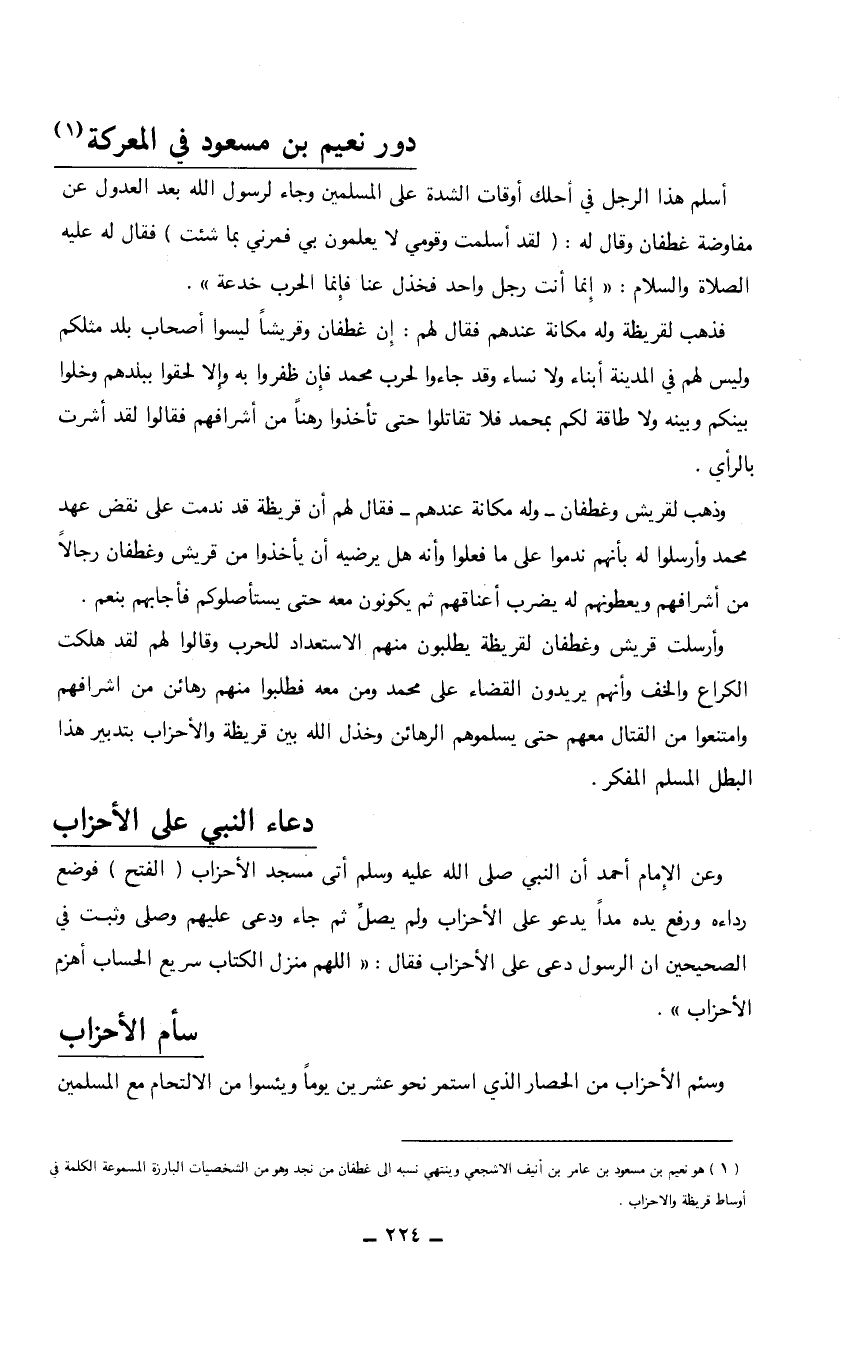 (1) هو نعيم بن مسعود بن عامر بن أنيف الاشجعي وينتهي نسبه إلى غطفان من نجد وهو من الشخصيات البارزة المسموعة الكلمة في أوساط قريظة والأحزاب.