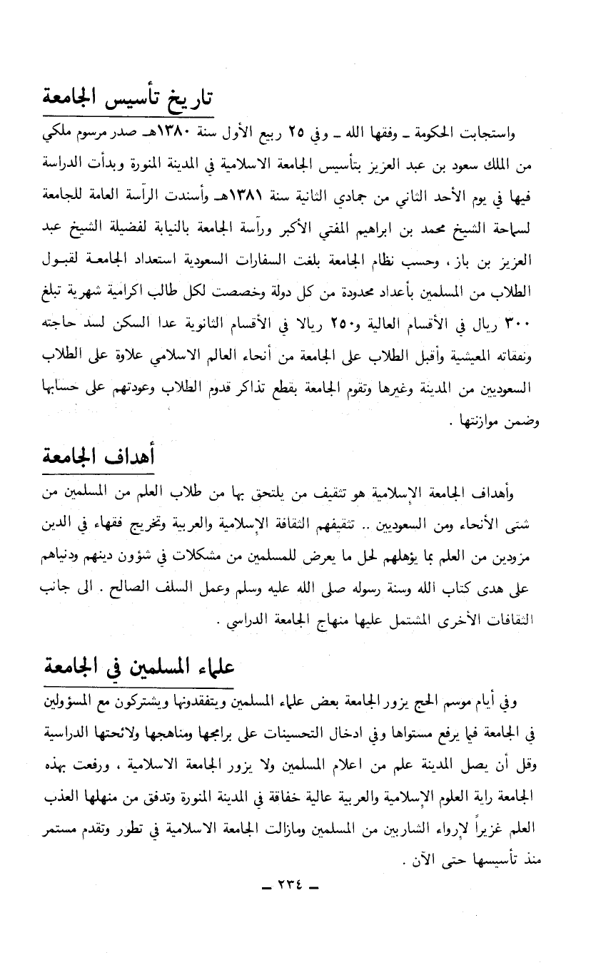 تاريخ تأسيس الجامعة واستجابت الحكومة-وفقها الله- وفي 25 ربيع الأول سنة 1380هـ صدر مرسوم ملكي من الملك سعود بن عبد العزيز بتأسيس الجامعة الاسلامية في المدينة المنورة وبدأت الدراسة فيها في يوم الأحد الثاني من جمادي الثانية سنة 1381هـ وأسندت الرآسة العامة للجامعة لسماحة الشيخ محمد بن إبراهيم المفتي الأكبر ورآسة الجامعة بالنيابة لفضيلة الشيخ عبد العزيز بن باز، وحسب نظام الجامعة بلغت السفارات السعودية استعداد الجامعة لقبول الطلاب من المسلمين بأعداد محدودة من كل دولة وخصصت لكل طالب اكرامية شهرية تبلغ 300 ريال في الأقسام العالية و250 ريالا في الأقسام الثانوية عدا السكن لسد حاجته ونفقاته المعيشية وأقبل الطلاب على الجامعة من أنحاء العالم الإسلامي علاوة على الطلاب السعوديين من المدينة وغيرها وتقوم الجامعة بقطع تذاكر قدوم الطلاب وعودتهم على حسابها وضمن موازنتها. أهداف الجامعة وأهداف الجامعة الإسلامية هو تثقيف من يلتحق بها من طلاب العلم من المسلمين من شتى الأنحاء ومن السعوديين .. تثقيفهم الثقافة الإسلامية والعربية وتخريج فقهاء في الدين مزودين من العلم بما يؤهلهم لحل ما يعرض للمسلمين من مشكلات في شؤون دينهم ودنياهم على هدى كتاب الله وسنة رسوله صلى الله عليه وسلم وعمل السلف الصالح. إلى جانب الثقافات الأخرى المشتمل عليها منهاج الجامعة الدراسي. علماء المسلمين في الجامعة وفي أيام موسم الحج يزور الجامعة بعض علماء المسلمين ويتفقدونها ويشتركون مع المسؤولين في الجامعة فيما يرفع مستواها وفي ادخال التحسينات على برامجها ومناهجها ولائحتها الدراسية وقل أن يصل المدينة علم من أعلام المسلمين ولا يزور الجامعة الإسلامية، ورفعت بهذه الجامعة راية العلوم الإسلامية والعربية عالية خفاقة في المدينة المنورة وتدفق من منهلها العذب العلم غزيراً لإرواء الشاربين من المسلمين ومازالت الجامعة الإسلامية في تطور وتقدم مستمر منذ تأسيسها حتى الآن.…