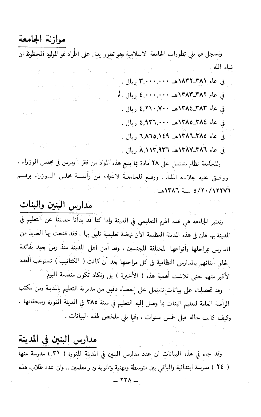 موازنة الجامعة ونسجل فيما يلي تطورات الجامعة الإسلامية وهو تطور يدل على أطراد نمو المولود المحظوظ إن شاء الله. في عام 381 - 1832هـ 3.000.000 ريال. في عام 382 - 1383هـ 4.000.000 ريال. في عام 383 - 1384هـ 4.210.700 ريال. في عام 384 - 1385هـ 4.936.000 ريال. في عام 385 - 1386هـ 6.865.149 ريال. في عام 386 - 1387هـ 8.113.936 ريال. وللجامعة نظام يشتمل على 28 مادة بما يتبع هذه المواد من فقر. ودرس في مجلس الوزراء، ووافق عليه جلالة الملك، ورفع للجامعة لاعتماده من رآسة مجلس الوزراء برقم 12276/ 20/ 5 سنة 1386هـ. مدارس البنين والبنات وتعتبر الجامعة هي قمة الهرم التعليمي في المدينة وإذا كنا قد بدأنا حديثنا عن التعليم في المدينة بها فإن في هذه المدينة العظيمة الآن نهضة تعليمية تليق بها، فقد فتحت بها العديد من المدارس بمراحلها وأنواعها المختلفة للجنسين، وقد آمن أهل المدينة منذ زمن بعيد بفائدة إلحاق أبنائهم بالمدارس النظامية في كل مراحلها بعد أن كانت (الكتاتيب) تستوعب العدد الأكبر منهم حتى تلاشت أهمية هذه (الأخيرة) بل وتكاد منعدمة اليوم. وقد تحصلت على بيانات تشتمل على إحصاء دقيق من مديرية التعليم بالمدينة ومن مكتب الرآسة العامة لتعليم البنات بما وصل إليه التعليم في سنة 385 في المدينة المنورة وملحقاتها، وكيف كانت حاله قبل خمس سنوات، وفيما يلي ملخص لهذه البيانات. مدارس البنين في المدينة وقد جاء في هذه البيانات أن عدد مدارس البنين في المدينة المنورة (31) مدرسة منها (24) مدرسة ابتدائية والباقي بين متوسطة ومهنية وثانوية ودار معلمين ... وأن عدد طلاب هذه…