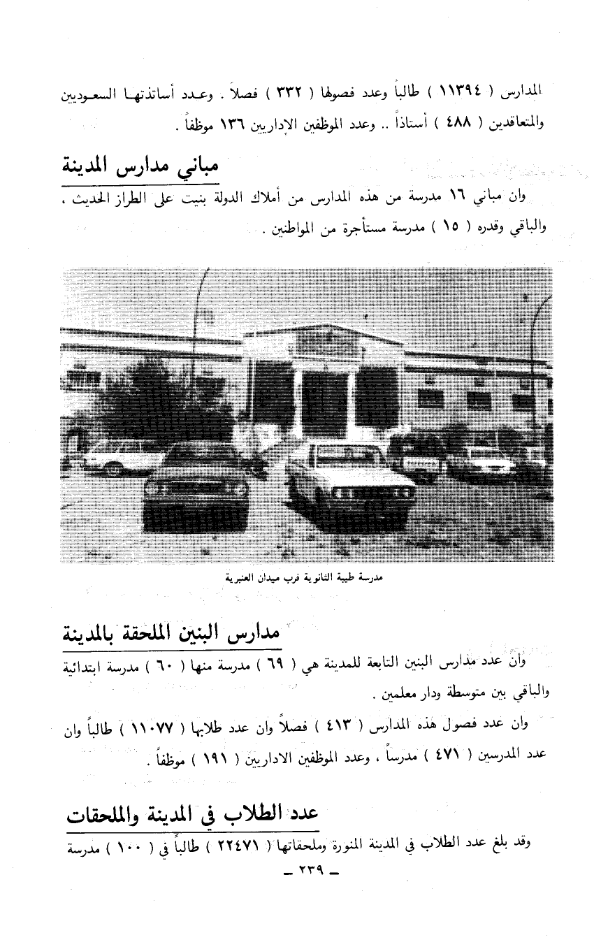 المدارس (11394) طالباً وعدد فصولها (332) فصلاً. وعدد أساتذتها السعوديين والمتعاقدين (488) أستاذاً .. وعدد الموظفين الإداريين 136موظفاً. مباني مدارس المدينة وأن مباني 16 مدرسة من هذه المدارس من أملاك الدولة بنيت على الطراز الحديث، والباقي وقدره (15) مدرسة مستأجرة من المواطنين. مدرسة طيبة الثانوية قرب ميدان العنبرية مدارس البنين الملحقة بالمدينة وإن عدد مدارس البنين التابعة للمدينة هي (69) مدرسة منها (60) مدرسة ابتدائية والباقي بين متوسطة ودار معلمين. وأن عدد فصول هذه المدارس (413) فصلاً وأن عدد طلابها (11077) طالباً وأن عدد المدرسين (471) مدرساً، وعدد الموظفين الإداريين (191) موظفاً. عدد الطلاب في المدينة والملحقات وقد بلغ عدد الطلاب في المدينة المنورة وملحقاتها (22471) طالباً في (100) مدرسة…