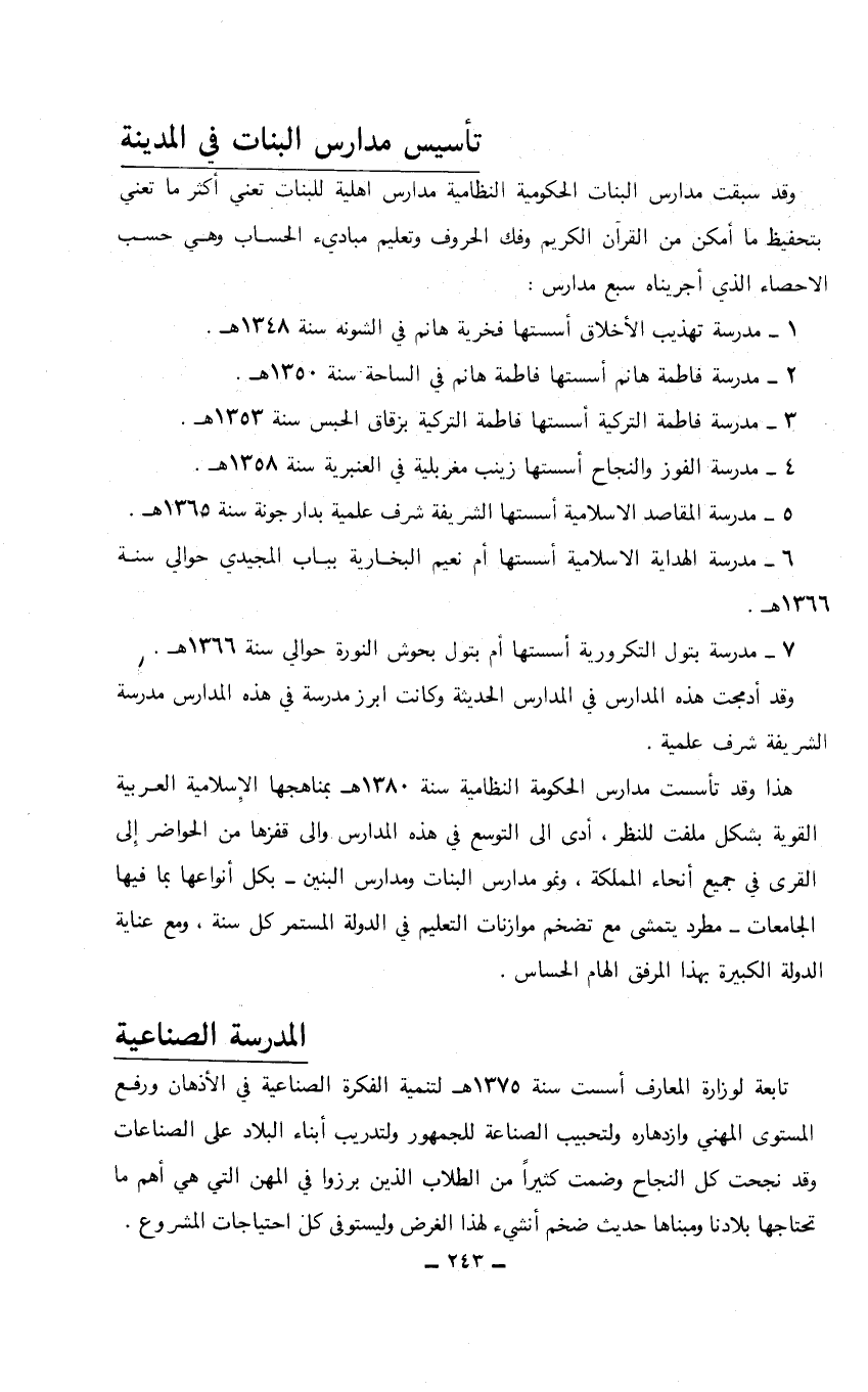 وقد أدمجت هذه المدارس في المدارس الحديثة وكانت أبرز مدرسة في هذه المدارس مدرسة الشريفة شرف علمية. هذا وقد تأسست مدارس الحكومة النظامية سنة 1380هـ بمناهجها الإسلامية العربية القوية بشكل ملفت للنظر، أدى إلى التوسع في هذه المدارس وإلى قفزها من الحواضر إلى القرى في جميع أنحاء المملكة، ونمو مدارس البنات ومدارس البنين- بكل أنواعها بما فيها الجامعات- مطرد يتمشى مع تضم موازنات التعليم في الدولة المستمر كل سنة، ومع عناية الدولة الكبيرة بهذا المرفق الهام الحساس. المدرسة الصناعية تابعة لوزارة المعارف أسست سنة 1375هـ لتنمية الفكرة الصناعية في الأذهان ورفع المستوى المهني وازدهاره ولتحبيب الصناعة للجمهور ولتدريب أبناء البلاد على الصناعات وقد نجحت كل النجاح وضمت كثيراً من الطلاب الذين برزوا في المهن التي هي أهم ما تحتاجها بلادنا ومبناها حديث ضخم أنشيء لهذا الغرض وليستوفى كل احتياجات المشروع.…