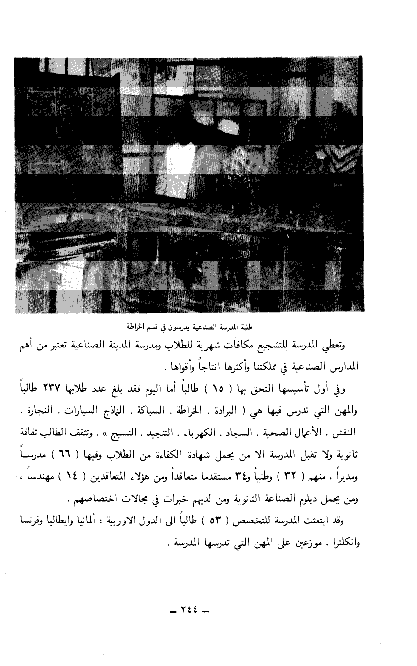 طلبة المدرسةالصناعية يدرسون في قسم الخراطة وتعطي المدرسة للتشجيع مكافات شهرية للطلاب ومدرسة المدينة الصناعية تعتبر من أهم المدارس الصناعية في ممملكتنا وأكثرها انتاجاً وأقواها. وفي أول تأسيسها التحق بها (15) طالباً أما اليوم فقد بلغ عدد طلابها 237 طالباً والمهن التي تدرس فيها هي (البرادة، الخراطة، السباكة. النماذج السيارات. النجارة. النقش. الأعمال الصحية. السجاد. الكهرباء. التنجيد. النسيج" وتثقف الطالب ثقافة ثانوية ولا تقبل المدرسة إلا من يحمل شهادة الكفاءة من الطلاب وفيها (66) مدرساً ومديراً، منهم (32) وطنياً و34 مستقدماً متعاقداً ومن هؤلاء المتعاقدين (14) مهندساً، ومن يحمل دبلوم الصناعة الثانوية ومن لديهم خبرات في مجالات اختصاصهم. وقد ابتعثت المدرسة للتخصص (53) طالباً إلى الدول الأوروبية: ألمانيا وإيطاليا وفرنسا وانكلترا، موزعين على المهن التي تدرسها المدرسة.…