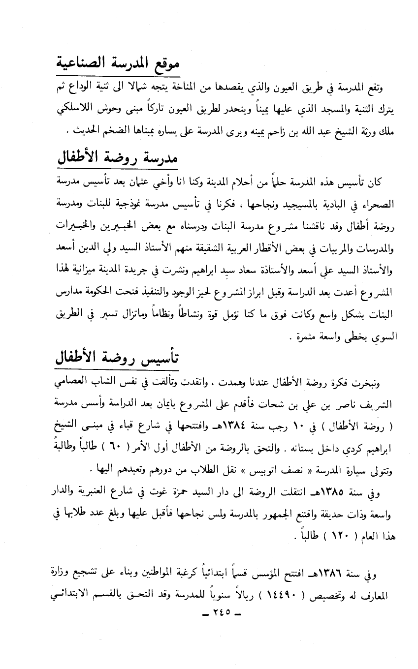 موقع المدرسة الصناعية وتقع المدرسة في طريق العيون والذي يقصدها من المناخة يتجه شمالاً إلى ثنية الوداع ثم يترك الثنية والمسجد الذي عليها يميناً وينحدر لطريق العيون تاركاً مبنى وحوش اللاسلكي ملك ورثة الشيخ عبدالله بن زاحم يمينه ويرى المدرسة على يساره بمبناها الضخم الحديث. مدرسة روضة الأطفال كان تأسيس هذه المدرسة حلماً من أحلام المدينة وكنا أنا وأخي عثمان بعد تأسيس مدرسة الصحراء في البادية بالمسيجيد ونجاحها، فكرنا في تأسيس مدرسة نموذجية للبنات ومدرسة روضة أطفال وقد ناقشنا مشروع مدرسة البنات ودرسناه مع بعض الخبيرين والخبيرات والمدرسات والمربيات في بعض الأقطار العربية الشقيقة منهم الأستاذ السيد ولي الدين أسعد والأستاذ السيد علي أسعد والأستاذة سعاد سيد إبراهيم ونشرت في جريدة المدينة ميزانية لهذا المشروع أعدت بعد الدراسة وقبل إبراز المشروع لحيز الوجود والتنفيذ فتحت الحكومة مدارس البنات بشكل واسع وكانت فوق ما كنا نؤمل قوة ونشاطاً ونظاماً وما تزال تسير في الطريق السوي يخطى واسعة مثمرة. تأسيس روضة الأطفال وتبخرت فكرة روضة الأطفال عندنا وهمدت، واتقدت وتألقت في نفس الشاب العصامي الشريف ناصر بن علي بن شحات فأقدم على المشروع بايمان بعد الدراسة وأسس مدرسة (روضة الأطفال) في 10 رجب سنة 1384هـ وافتتحها في شارع قباء في مبنى الشيخ إبراهيم الكردي داخل بستانه. والتحق بالروضة من الأطفال أول الأمر (60) طالباً وطالبةً وتتولى سيارة المدرسة "نصف اتوبيس" نقل الطلاب من دورهم وتعيدهم إليها. وفي سنة 1385هـ انتقلت الروضة في دار السيد حمزة غوث في شارع العنبرية والدار واسعة وذات حديثة واقتنع الجمهور بالمدرسة ولمس نجاحها فأقبل عليها وبلغ عدد طلابها في هذا العام (120) طالباً. وفي سنة 1386هـ افتتح المؤسس قسماً ابتدائياً كرغبة المواطنين وبناء على تشجيع وزارة المعارف له وتخصيص (14490) ريالاً سنوياً للمدرسة وقد التحق بالقسم الابتدائي…