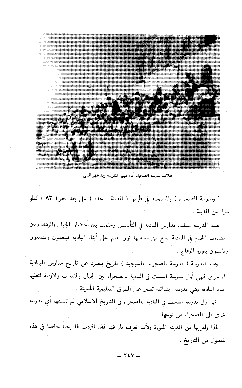 طلاب مدرسة الصحراء أمام مبنى المدرسة وقد ظهر المبنى (ومدرسة الصحراء) بالمسيجيد في طريق (المدينة- جدة) على بعد نحو (83) كيلو متراً عن المدينة. هذه المدرسة سبقت مدارس البادية في التأسيس وجثمت بين أحضان الجبال والوهاد وبين مضارب الخيام في البادية يشع من مشعلها نور العلم على أبناء البادية فينعمون ويتمتعون ويأسون بنوره الوهاج. ولهذه المدرسة (مدرسة الصحراء بالمسيجيد) تاريخ ينفرد عن تاريخ مدارس البادية الأخرى فهي أول مدرسة أسست في البادية بالصحراء بين الجبال والشعاب والأودية لتعليم أبناء البادية وهي مدرسة ابتدائية تسير على الطرق التعليمية الحديثة. إنها أول مدرسة أسست في البادية بالصحراء في التاريخ الإسلامي لم تسبقها أي مدرسة أخرى إلى الصحراء من نوعها. لهذا ولقربها من المدينة المنورة ولأننا نعرف تاريخها فقد أفردت لها بحثاً خاصاً في هذه الفصول من التاريخ.…