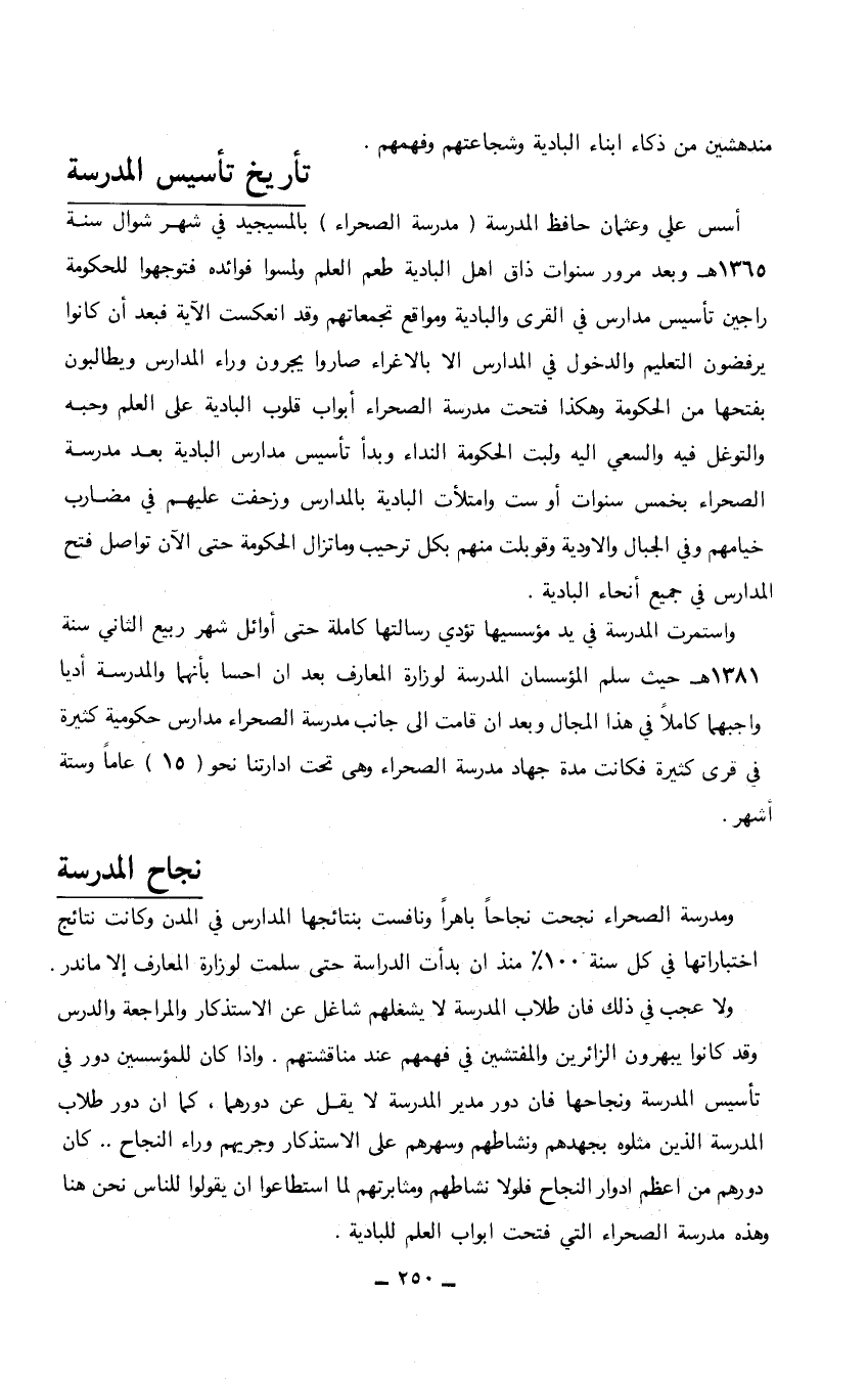 مندهشين من ذكاء ابناء البادية وشجاعتهم وفهمهم. تأريخ تأسيس المدرسة أسس علي وعثمان حافظ المدرسة (مدرسة الصحراء) بالمسيجيد في شهر شوال سنة 1365هـ وبعد مرور سنوات ذاق أهل البادية طعم العلم ولمسوا فوائده فتوجهوا للحكومة راجين تأسيس مدارس في القرى والبادية ومواقع تجمعاتهم وقد انعكست الآية فبعد أن كانوا يرفضون التعليم والدخول في المدارس إلا بالإغراء صاروا يجرون وراء المدارس ويطالبون بفتحها من الحكومة وهكذا فتحت مدرسة الصحراء أبواب قلوب البادية على العلم وحبه والتوغل فيه والسعي إليه ولبت الحكومة النداء وبدأ تأسيس مدارس البادية بعد مدرسة الصخراء بخمس سنوات أو ست وامتلأت البادية بالمدارس وزحفت عليهم في مضارب خيامهم وفي الجبال والأودية وقوبلت منهم بكل ترحيب وما تزال الحكومة حتى الآن تواصل فتح المدارس في جميع أنحاء البادية. واستمرت المدرسة في يد مؤسسيها تؤدي رسالتها كاملة حتى أوائل شهر ربيع الثاني سنة 1381هـ حيث سلم المؤسسان المدرسة لوزارة المعارف بعد أن أحسا بأنهما والمدرسة أديا واجبهما كاملاص في هذا المجال وبعد أن قامت إلى جانب مدرسة الصحراء مدارس حكومية كثيرة في قرى كثيرة فكانت مدة جهاد مدرسة الصحراء وهي تحت ادارتنا نحو (15) عاماً وستة أشهر. نجاح المدرسة ومدرسة الصحراء نجحت نجاحاً باهراً ونافست بنتائجها المدارس في المدن وكانت نتائج اختباراتها في كل سنة 100% منذ أن بدأت الدراسة حتى سلمت لوزارة المعارف إلا ما ندر. ولا عجب في ذلك فإن طلاب المدرسة لا يشغلهم شاغل عن الاستذكار والمراجعة والدرس وقد كانوا يبهرون الزائرين والمفتشين في فهمهم عند مناقشتهم. وإذا كان للمؤسسين دور في تأسيس المدرسة ونجاحها فإن دور مدير المدرسة لا يقل عن دورهما، كما أن دور طلاب المدرسة الذين مثلوه بجهدهم ونشاطهم وسهرهم على الاستذكار وجريهم وراء النجاح .. كان دورهم من أعظم أدوار النجاح فلولا نشاطهم ومثابرتهم لما استطاعوا أن يقولوا للناس نحن هنا وهذه مدرسة الصحراء التي فتحت أبواب العلم للبادية.…
