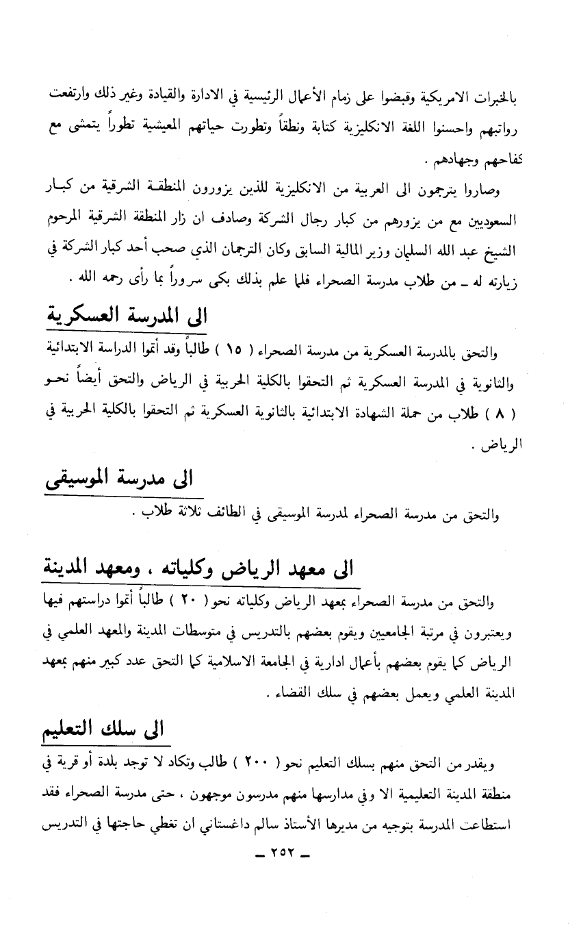 بالخبرات الأمريكية وقبضوا على زمام الأعمال الرئيسية في الإدارة والقيادة وغير ذلك وارتفعت رواتبهم واحسنوا اللغة الإنكليزية كتابة ونطقاً وتطورت حياتهم المعيشية تطوراً يتمشى مع كفاحهم وجهادهم. وصاروا يترجمون إلى العربية من الإنكليزية للذين يزورون المنطقة الشرقية من كبار السعوديين مع من يزوروهم من كبار رجال الشركة وصادف أن زار المنطقة الشرقية المرحوم الشيخ عبدالله السليمان وزير المالية السابق وكان الترجمان الذي صحب أحد كبار الشركة في زيارته له - من طلاب مدرسة الصحراء فلما علم بذلك بكى سروراً بما رأى رحمه الله. إلى المدرسة العسكرية والتحق بالمدرسة العسكرية من مدرسة الصحراء (15) طالباً وقد أتموا الدراسة الابتدائية والثانوية في المدرسة العسكرية ثم التحقوا بالكلية الحربية في الرياض والتحق أيضاً نحو (8) طلاب من حملة الشهادة الابتدائية بالثانوية العسكرية ثم التحقوا بالكلية الحربية في الرياض. إلى مدرسة الموسيقى والتحق من مدرسة الصحراء لمدرسة الموسيقى في الطائف ثلاثة طلاب. إلى معهد الرياض وكلياته، ومعهد المدينة والتحق من مدرسة الصحراء بمعهد الرياض وكلياته نحو (20) طالباً أتموا دراستهم فيها ويعتبرون في مرتبة الجامعيين ويقوم بعضهم بالتدريس في متوسطات المدينة والمعهد العلمي في الرياض كما يقوم بعضهم بأعمال ادارية في الجامعة الإسلامية كما التحق عدد كبير منهم بمعهد المدينة العلمي ويعمل بعضهم في سلك القضاء. إلى سلك التعليم ويقدر من التحق منهم بسلك التعليم نحو (200) طالب وتكاد لا توجد بلدة أو قرية في منطقة المدينة التعليمية إلا وفي مدارسها منهم مدرسون موجهون، حتى مدرسة الصحراء فقد استطاعت المدرسة بتوجيه من مديرها الأستاذ سالم داغستاني أن تغطي حاجتها في التدريس…