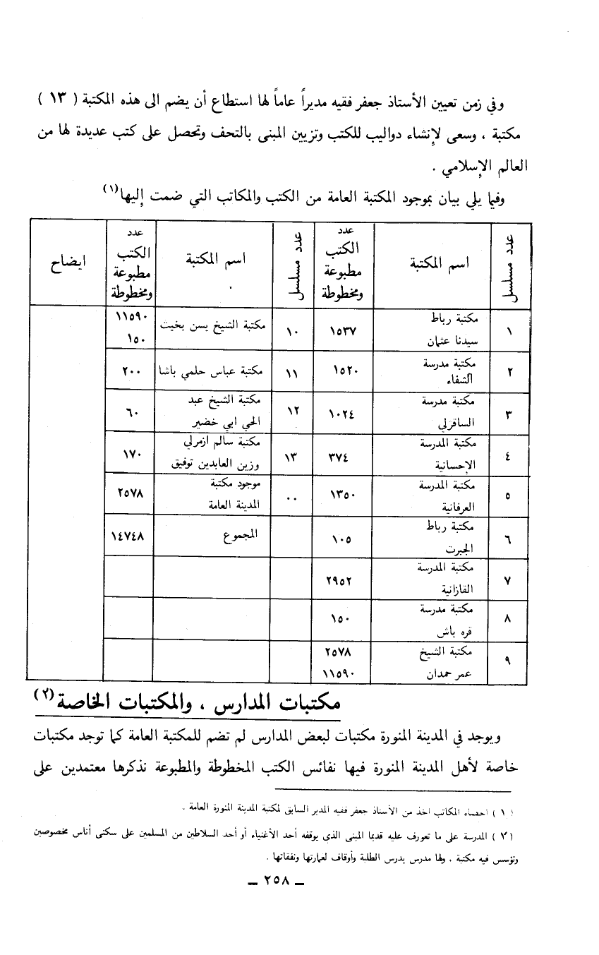 (1) احصاء المكاتب أخذ من الأستاذ جعفر ففيه المدير السابق لمكتبة المدينة المنورة العامة.