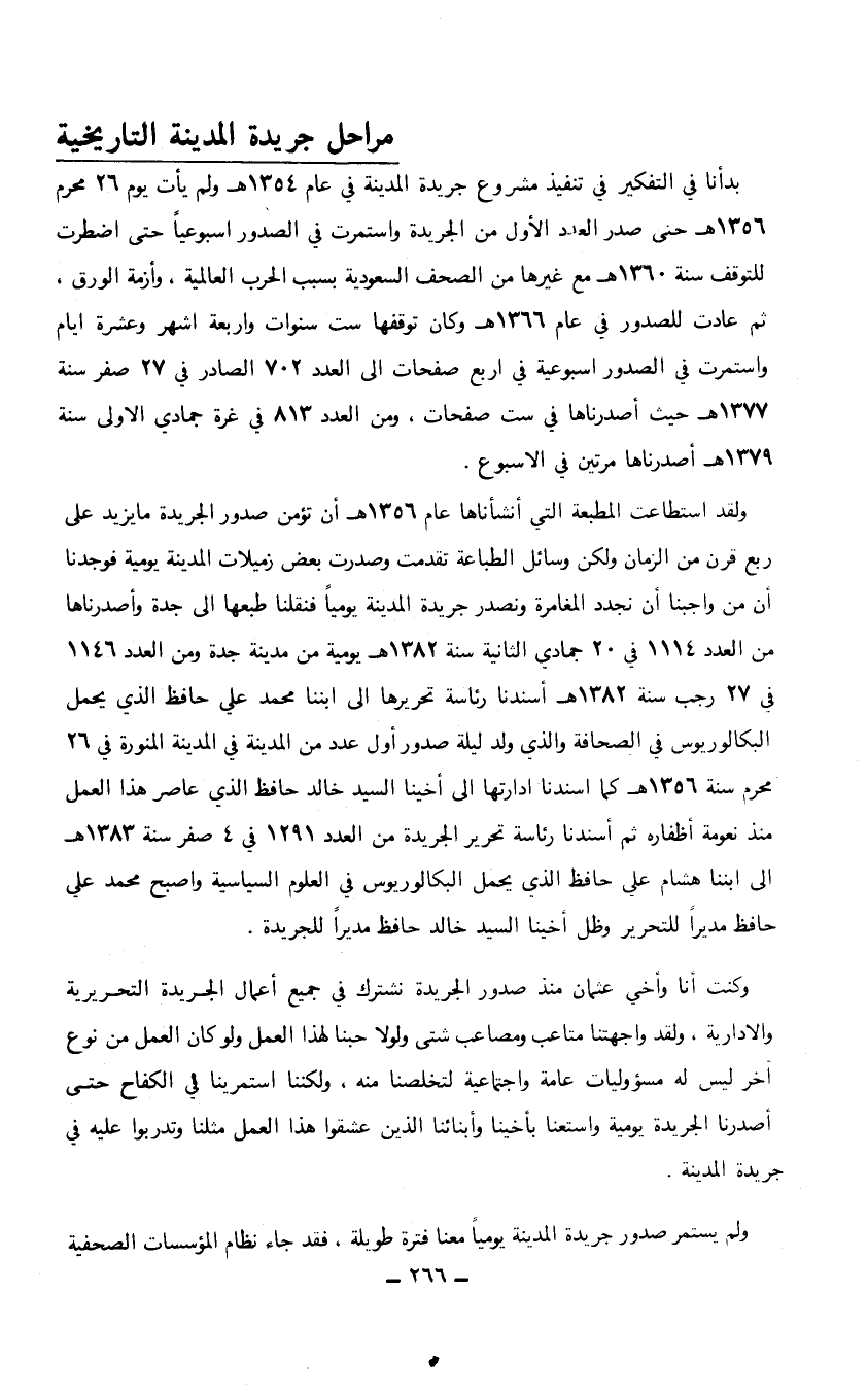مراحل جريدة المدينة التاريخية بدأنا في التفكير في تنفيذ مشروع جريدة المدينة في عام 1354هـ ولم يأت يوم 26 محرم 1356هـ حتى صدر العدد الأول من الجريدة واستمرت في الصدور اسبوعياً حتى اضطرت للتوقف سنة 1360هـ مع غيرها من الصحف السعودية بسبب الحرب العالمية، وأزمة الورق، ثم عادت للصدور في عام 1366هـ وكان توقفها ست سنوات وأربعة أشهر وعشرة أيام واستمرت في الصدور اسبوعية في أربع صفحات إلى العدد 702 الصادر في 27 صفر سنة 1377هـ حيث أصدرناها في ست صفحات، ومن العدد 813 في غرة جمادي الأولى سنة 1379هـ أصدرناها مرتين في الأسبوع. ولقد استطاعت المطبعة التي أنشأناها عام 1356هـ أن تؤمن صدور الجريدة ما يزيد على ربع قرن من الزمان ولكن وسائل الطباعة تقدمت وصدرت بعض زميلات المدينة يومية فوجدنا أن من واجبنا أن نجدد المغامرة ونصدر جريدة المدينة يومياً فنقلنا طبعها إلى جدة وأصدرناها من العدد 1114 في 20 جمادي الثانية سنة 1382هـ يومية من مدينة جدة ومن العدد 1146 في 27 رجب سنة 1382هـ أسندنا رئاسة تحريرها إلى ابننا محمد علي حافظ الذي يحمل البكالوريوس في الصحافة والذي ولد ليلة صدور أول عدد من المدينة في المدينة المنورة في 26 محرم سنة 1356هـ كما أسندنا ادارتها إلى أخينا السيد خالد حافظ الذي عاصر هذا العمل منذ نعومة أظفاره ثم أسندنا رئاسة تحرير الجريدة من العدد 1291 في 4 صفر سنة 1383هـ إلى إبننا هشام علي حافظ الذي يحمل البكالوريوس في العلوم السياسية وأصبح محمد علي حافظ مديراً للتحرير وظل أخينا السيد خالد حافظ مديراً للجريدة. وكنت أنا وأخي عثمان منذ صدور الجريدة نشترك في جميع أعمال الجريدة التحريرية والإدارية، ولقد واجهتنا متاعب ومصاعب شتى ولولا حبنا لهذا العمل ولو كان العمل من نوع آخر ليس له مسؤوليات عامة واجتماعية لتخلصنا منه، ولكننا استمر بنا في الكفاح حتى أصدرنا الجريدة يومية واستعنا بأخينا وأبنائنا الذين عشقوا هذا العمل مثلنا وتدربوا عليه في جريدة المدينة. ولم يستمر صدور جريدة المدينة يومياً معنا فترة طويلة، فقد جاء نظام المؤسسات الصحفية…