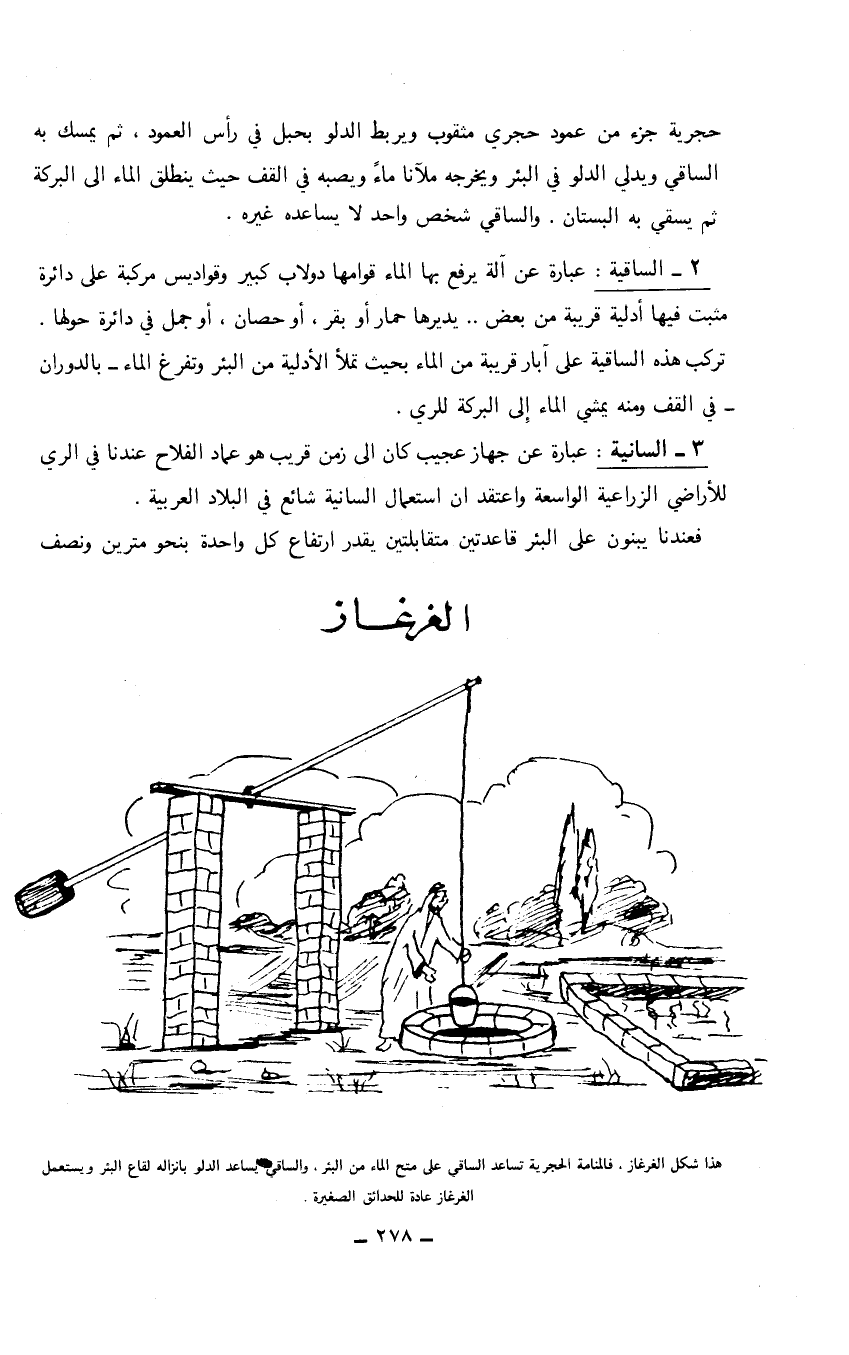 3 - السانية: عبارة عن جهاز عجيب كان إلى زمن قريب هو عماد الفلاح عندنا في الري للأراضي الزراعية الواسعة واعتقد أن استعمال السانية شائع في البلاد العربية. فعندنا يبنون على البئر قاعدتين متقابلتين يقدر ارتفاع كل واحدة بنحو مترين ونصف هذا شكل الغرغاز، فالمنامة الحجرية تساعد الساقي على متح الماء من البئر، والساقي يساعد الدلو بانزاله لقاع البئر ويستعمل الغرغاز عادة للحدائق الصغيرة.…