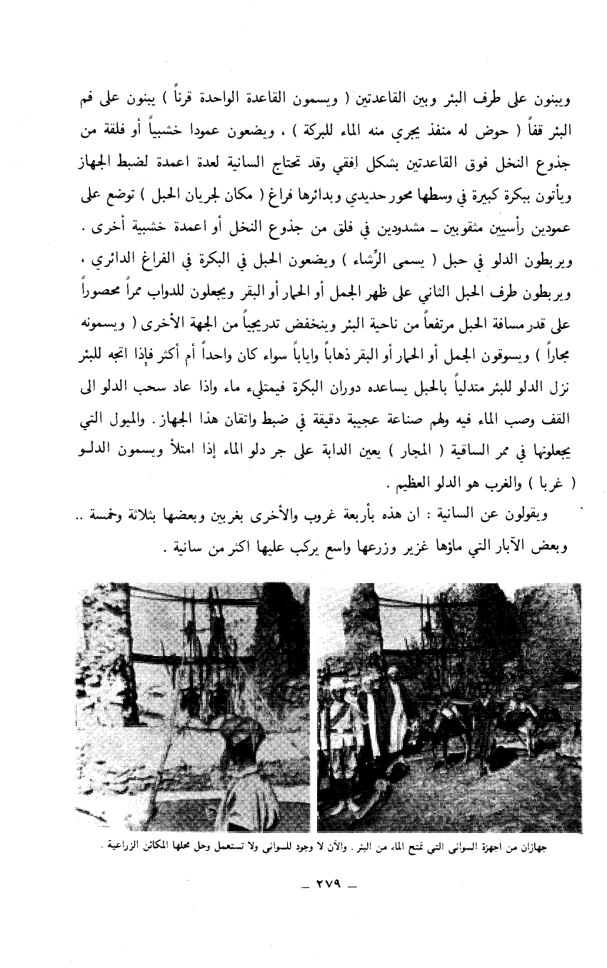 ويبنون على طرف البئر وبين القاعدتين (ويسمون القاعدة الواحدة قرناً) يبنون على فم البئر قفاً (حوض له منفذ يجري منه الماء للبركة)، ويضعون عموداً خشبياً أو فلقة من جذوع النخل فوق القاعدتين بشكل أفقي وقد تحتاج السانية لعدة أعمدة لضبط الجهاز ويأتون ببكرة كبيرة في وسطها محور حديدي وبدائرها فراغ (مكان لجريان الحبل) توضع على عمودين رأسيين مثقوبين- مشدودين في فلق من جذوع النخل أو أعمدة خشبية أخرى. ويربطون الدلو في حبل (يسمى الرشاء) ويضعون الحبل في البكرة في الفراغ الدائري، ويربطون طرف الحبل الثاني على ظهر الجمل أو الحمار أو البقر ويجعلون للدواب ممراً محصوراً على قدر مسافة الحبل مرتفعاً من ناحية البئر وينخفض تدريجياً من الجهة الأخرى (ويسمونه مجاراً) ويسوقون الجمل أو الحمار أو البقر ذهاباً واياباً سواء كان واحداً أم أكثر فإذا اتجه للبئر نزل الدلو للبئر متدلياً بالحبل يساعده دوران البكرة فيمتليء ماء وإذا عاد سحب الدلو إلى القف وصب الماء فيه ولهم صناعة عجيبة دقيقة في ضبط واتقان هذا الجهاز. والميول التي يجعلونها في ممر الساقية (المجار) يعين الدابة على جر دلو الماء إذا امتلأ ويسمون الدلو (غربا) والغرب هو الدلو العظيم. ويقولون عن السانية: أن هذه بأربعة غروب والأخرى بغربين وبعضها بثلاثة وخمسة ... وبعض الآبار التي ماؤها غزير وزرعها واسع يركب عليها أكثر من سانية. جهازان من أجهزة السواني التي تمتح الماء من البئر، والآن لا وجود للسواني ولا تستعمل وحل محلها المكائن الزراعية.…