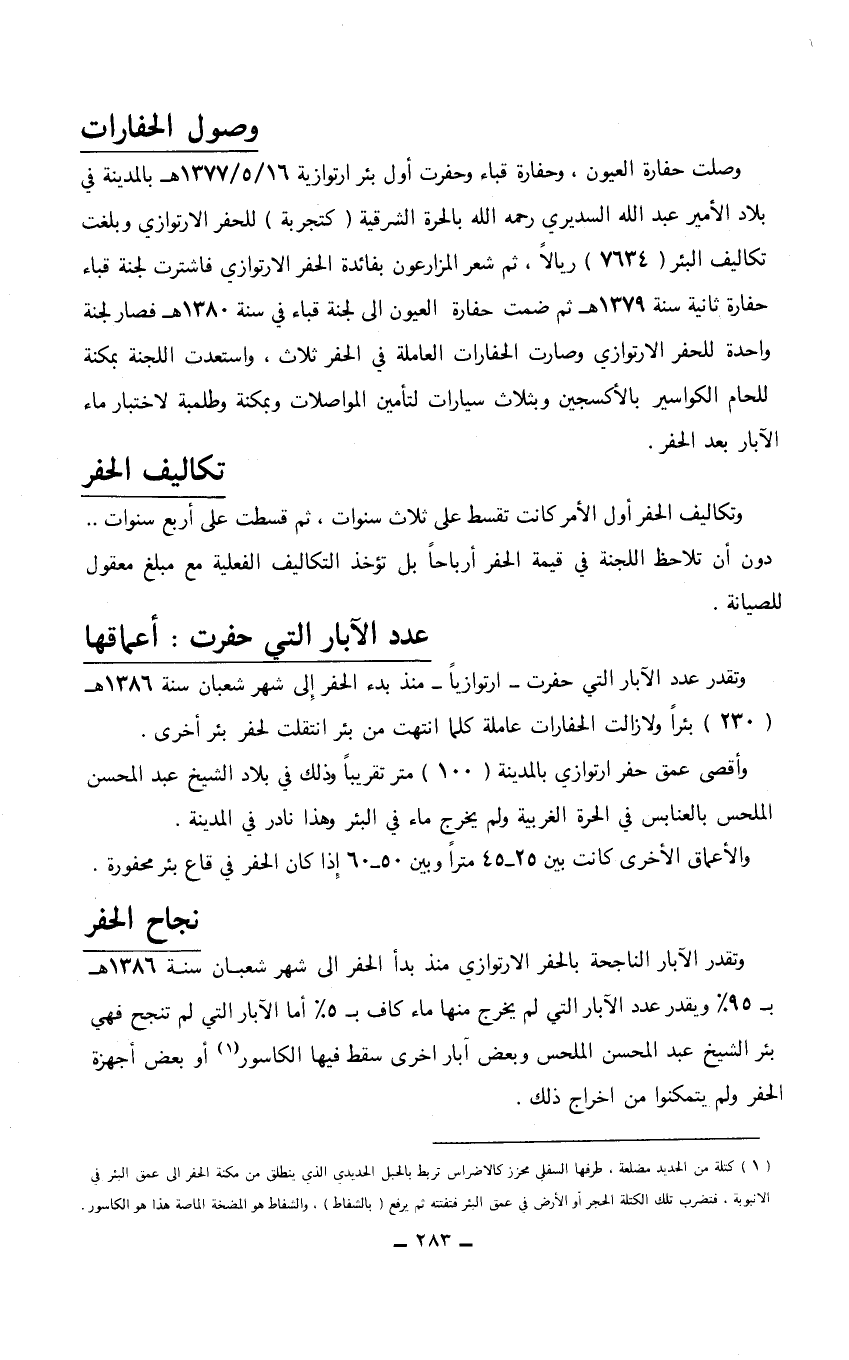 وصول الحفارات وصلت حفارة العيون، وحفارة قباء وحفرت أول بئر ارتوازية 16/ 5/ 1377هـ بالمدينة في بلاد الأمير عبدالله السديري رحمه الله بالحرة الشرقية (كتجربة) للحفر الارتوازي وبلغت تكاليف البئر (7634) ريالاً، ثم شعر المزارعون بفائدة الحفر الارتوازي فاشترت لجنة قباء حفارة ثانية سنة 1379هـ ثم ضمت حفارة العيون إلى لجنة قباء في سنة 1380هـ فصار لجنة واحدة للحفر الارتوازي وصارت الحفارات العاملة في الحفر ثلاث، واستعدت اللجنة بمكنة للحام الكواسير بالأكسجين وبثلاث سيارات لتأمين المواصلات وبمكنة وطلمبة لاختبار ماء الآبار بعد الحفر. تكاليف الحفر وتكاليف الحفر أول الأمر كانت تقسط على ثلاث سنوات، ثم قسطت على أربع سنوات .. دون أن تلاحظ اللجنة في قيمة الحفر أرباحاً بل تؤخذ التكاليف الفعلية مع مبلغ معقول للصيانة. عدد الآبار التي حفرت: أعماقها وتقدر عدد الآبار التي حفرت- ارتوازياً- منذ بدء الحفر إلى شهر شعبان سنة 1386هـ (230) بئراً ولا زالت الحفارات عاملة كلما انتهت من بئر انتقلت لحفر بئر أخرى. وأقصى عمق حفر ارتوازي بالمدينة (100) متر تقريباً وذلك في بلاد الشيخ عبد المحسن الملحس بالعنابس في الحرة الغربية ولم يخرج ماء في البئر وهذا نادر في المدينة. والأعماق الأخرى كانت بين 25 - 45 متراً وبين 50 - 60 إذا كان الحفر في قاع بئر محفورة. نجاح الحفر وتقدر الآبار الناجحة بالحفر الارتوازي منذ بدأ الحفر إلى شهر شعبان سنة 1386هـ بـ 95% ويقدر عدد الآبار التي لم يخرج منها ماء كاف بـ 50% أما الآبار التي لم تنجح فهي بئر الشيخ عبد المحسن الملحس وبعض آبار أخرى سقط فيها الكاسور (1) أو بعض أجهزة الحفر ولم يتمكنوا من اخراج ذلك.