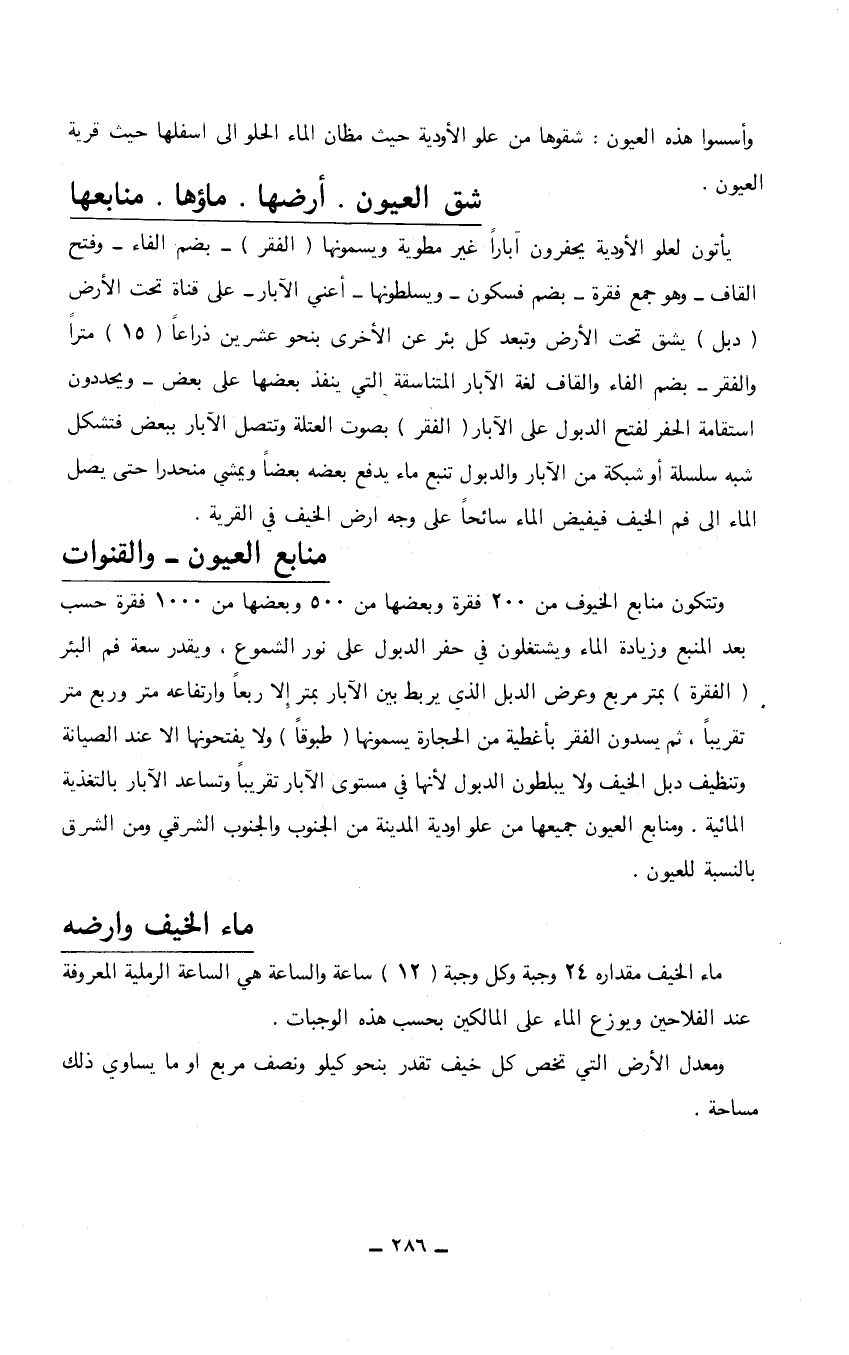 وتتكون منابع الخيوف من 200 فقرة وبعضها من 500 وبعضها من 1000 فقرة حسب بعد المنبع وزيادة الماء ويشتغلون في حفر الدبول على نور الشموع، ويقدر سعة فم البئر (الفقرة) بمتر مربع وعرض الدبل الذي يربط بين الآبار بمتر إلا ربعاً وارتفاعه متر وربع متر تقريباً، ثم يسدون الفقر بأغطية من الحجارة يسمونها (طبوقاً) ولا يفتحونها إلا عند الصيانة وتنظيف دبل الخيف ولا يبلطون الدبول لأنها في مستوى الآبار تقريباً وتساعد الآبار بالتغذية المائية. ومنابع العيون جميعها من علو أودية المدينة من الجنوب والجنوب الشرقي ومن الشرق بالنسبة للعيون. ماء الخيف وأرضه ماء الخيف مقداره 24 وجبة (12) ساعة والساعة هي الساعة الرملية المعروفة عند الفلاحين ويوزع الماء على المالكين بحسب هذه الوجبات. ومعدل الأرض التي تخص كل خيف تقدر بنحو كيلو ونصف مربع أو ما يساوي ذلك مساحة.…