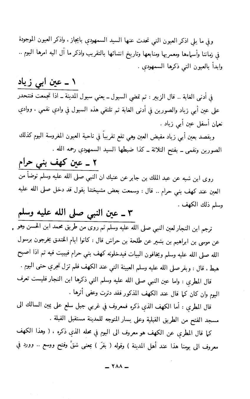 3 - عين النبي صلى الله عليه وسلم ترجم ابن النجار لعين النبي صلى الله عليه وسلم ثم روى من طريق محمد ابن الحسن وهو عن موسى بن إبراهيم بن بشير عن طلحة بن حراش قال: كانوا أيام الخندق يخرجون برسول الله صلى الله عليه وسلم ويخافون البيات فيدخلونه كهف بني حرام فيبيت فيه ثم إذا أصبح هبط، قال: وبقر صلى الله عليه وسلم العيينة التي عند الكهف فلم تزل تجري حتى اليوم. قال المطري: وأما عين النبي صلى الله عليه وسلم التي ذكرها ابن النجار فليست تعرف اليوم وإن كان كما قال عند الكهف المذكور فقد دثرت وعفى أثرها. قال المطري: أما الكهف الذي ذكره فمعروف في غربي جبل سلع على يمين السالك إلى مسجد الفتح من الطريق القبلية وعلى يسار المتوجه للمدينة مستقبل القبلة. كما قال المطري عن الكهف هو معروف إلى اليوم في محله الذي ذكره. (وهذا الكهف معروف إلى يومنا هذا عند أهل المدينة) وقوله (بقر) بمعنى شق وفتح ووسع ... وورد فيه…