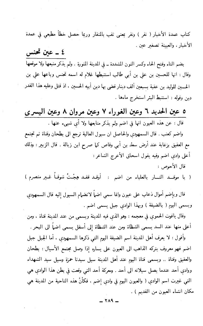 قال: عن هذه العيون إنها في اضم ولم يذكر منابعها ولا أي شيء عنها. واضم كعنب، قال السمهودي والحاصل أن سيول العالية ترجع إلى بطحان وقناة ثم تجتمع مع العقيق بزغابة عند أرض سعد بن أبي وقاص كما صرح ابن زبالة. قال الزبير: وذلك أعلى وادي اضم وفيه يقول اسحاق الأعرج الشاعر: قال الأحوص: (يا موقد النار بالعلياء من اضم: أوقد فقد هجت شوقاً غير منصرم) قال وبإضم أموال ذعاب على عيون وإنما سمي اضماً لانضمام السيول إليه قال السمهودي ويسمى اليوم (بالضيقة) وبهذا الوادي جبل يسمى اضم. وقال ياقوت الحموي في معجمه: وهو الذي فيه المدينة ويسمى من عند المدينة قناة، ومن أعلى منها عند السيد يسمى الشظاة ومن عند الشظاة إلى أسفل يسمى اضماً إلى البحر. وأقول: لا يعرف أهل المدينة اسم الضيقة اليوم التي ذكرها السمهودي، أما الجبل جبل اضم فهو معروف يتركه الذاهب إلى العيون على يساره إذا وصل مجتمع الأسيال: بطحان والعقيق وقناة ... ويسمى قناة اليوم عند أهل المدينة سيل سيدنا حمزة وسيل سيد الشهداء ووادي أحد عندما يصل سيلانه إلى أحد. ومعركة أحد التي وقعت في بطن هذا الوادي هي التي غيرت اسم الوادي (والعيون اليوم في وادي إضم، فكأن هذه الناحية من المدينة هي مكان انشاء العيون من القديم).…