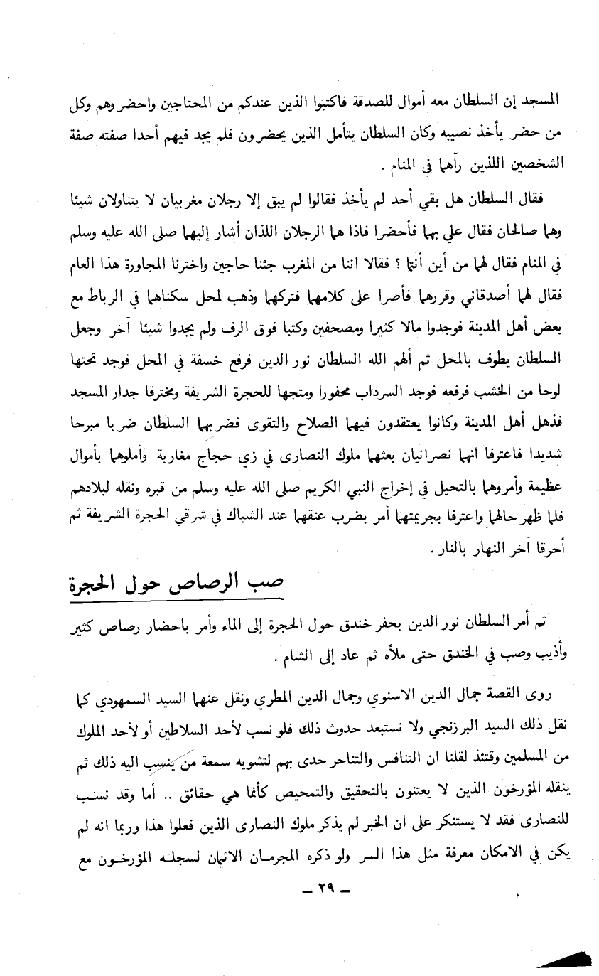 فقال السلطان هل بقي أحد لم يأخذ فقالوا لم يبق إلا رجلان مغربيان لا يتناولان شيئاً وهما صالحان فقال علي بهما فأحضرا فاذا هما الرجلان اللذان أشار إليهما صلى الله عليه وسلم في المنام فقال لهما من أين أنتما؟ فقالا أننا من المغرب جئنا حاجين واخترنا المجاورة هذا العام فقال لهما أصدقاني وقررهما فأصرا على كلامهما فتركهما وذهب لمحل سكناهما في الرباط مع بعض أهل المدينة فوجدوا مالاً كثيراً ومصحفين وكتباً فوق الرف ولم يجدوا شيئاً آخر وجعل السلطان يطوف بالمحل ثم ألهم الله السلطان نور الدين فرفع خسفة في المحل فوجد تحتها لوحا من الخشب فرفعه فوجد السرداب محفوراً ومتجها للحجرة الشريفة ومخترقا جدار المسجد فذهل أهل المدينة وكانوا يعتقدون فيهما الصلاح والتقوى فضربهما السلطان ضرباً مبرحاً شديداً فاعترفا أنهما نصرانيان بعثهما ملوك النصارى في زي حجاج مغاربة واملوها بأموال عظيمة وأمروهما بالتحيل في إخراج النبي الكريم صلى الله عليه وسلم من قبره ونقله لبلادهم فلما ظهر حالهما واعترفا بجريمتهما أمر بضرب عنقهما عند الشباك في شرقي الحجرة الشريفة ثم أحرقا آخر النهار بالنار.