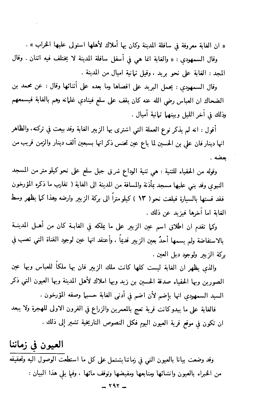 " إن الغابة معروفة في سافلة المدينة وكان بها أملاك لأهلها استولى عليها الخراب". وقال السمهودي: "والغابة إنما هي في أسفل سافلة المدينة لا يختلف فيه اثنان. وقال المجد: الغابة على نحو بريد، وقيل ثمانية أميال من المدينة. وقال السمهودي: يحمل البريد على أقصاها وما بعده على أثنائها وقال: عن محمد بن الضحاك أن العباس رضي الله عنه كان يقف على سلع فينادي غلمانه وهم بالغابة فيسمعهم وذلك في آخر الليل وبينهما ثمانية أميال. أقول: أنه لم يذكر نوع العملة التي اشترى بها الزبير الغابة وقد بيعت في تركته، والظاهر إنها دينار فإن علي بن الحسين لما باع عين تحنس ذكر أنها بسبعين ألف دينار والزمن قريب من بعضه. وقوله من الحفياء للثنية: هي ثنية الوداع شرق جبل سلع على نحو كيلو متر من المسجد النبوي وقد بني عليها مسجد بمأذنة والمسافة من المدينة إلى الغابة (تقارب ما ذكره المؤرخون فقد قستها بالسيارة فبلغت نحو (13) كيلو متراً إلى بركة الزبير وأرضه وهذا كما يظهر وسط الغابة أما آخرها فيزيد عن ذلك. وكما تقدم أن إطلاق اسم عين الزبير على ما يملكه في الغابة كان من أهل المدينة بالاستفاضة ولم يسمها أحدٌ بعين الزبير قديماً، وأعتقد أنها عين لوجود القناة التي تصب في بركة الزبير ولوجود دبل العين. والذي يظهر أن الغابة ليست كلها كانت ملك الزبير فإن بها ملكاص للعباس وبها عين الصورين وبها الحفياء صدقة الحسين بن زيد وبها املاك لأهل المدينة وبها العيون التي ذكر السيد السمهودي إنها بإضم لان اضم في أدنى الغابة حسبما وصفه المؤرخون. فالغابة على ما يبدو كانت قرية تعج بالمعمرين والزراع في القرون الأولى للهجرة ولا يبعد أن تكون في موقع قرية العيون اليوم فكل النصوص التاريخية تشير إلى ذلك. العيون في زماننا وقد وضعت بياناً بالعيون التي في زماننا يشتمل على كل ما استطعت الوصول إليه وتحقيقه من الخبراء بالعيون وانشائها ومنابعها ومفيضها وتوقف مائها، وفيما يلي هذا البيان:…
