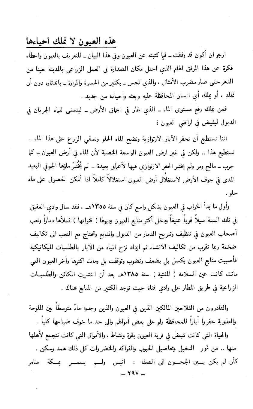 إننا نستطيع أن نحفر الآبار الأرتوازية ونضخ الماء الحلو ونسقي الزرع على هذا الماء ... نستطيع هذا .. ولكن في غير أرض العيون الواسعة الخصبة لأن الماء في أرض العيون- كما جرب- مالح ومر ولم يختبر الحفر الارتوازي فيها لأعماق بعيدة ... لم يختبر ماؤها الجوفي البعيد المدى في جوف الأرض لاستغلال أرض العيون استغلالاً كاملاً إذا أمكن الحصول على ماء حلو.