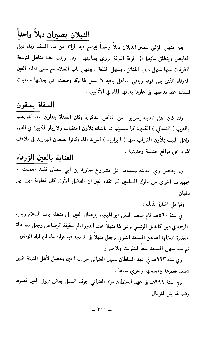 الدبلان يصيران دبلاً واحداً ومن منهل الزكي يصير الدبلان دبلاً واحداً يجتمع فيه الزائد من ماء السقيا وماء دبل الفايض وينطلق ماؤهما إلى قرية البركة تروي بساتينها، وقد ازيلت عدة مناهل لتوسعة الطرقات منها منهل درب الجنائز، ومنهل القلعة، ومنهل باب السلام مع مبنى إدارة العين الزرقاء الذي بنى فوقه وباقي المناهل باقية لا عمل لها وقد وضعت على بعضها حنفيات للسقيا عند مدخلها في علوها يصلها الماء في الأنابيب. السقاة يسقون وقد كان أهل المدينة يشربون من المناهل المذكورة وكان السقاة ينقلون الماء لدورهم بالقرب (الشعالي) الكبيرة كما يسمونها ثم بالتنك يملأون الحنفيات والأزيار الكبيرة في الدور وأهل البيت يملأون الشراب منها (البراريد) لتبريد الماء وكانوا يضعون البراريد في ملاقف الهواء على مرافع خشبية وحديدية. العناية بالعين الزرقاء ولم يقتصر ري المدينة وسقياها على مشروع معاوية بن أبي سفيان فقد ضمت له مجهودات أخرى من ملوك المسلمين كما تقدم غير أن الفضل الأول كان لمعاوية ابن أبي سفيان. وفيما يلي اشارة لذلك: في سنة 560هـ قام سيف الدين أبو الهيجاء بإيصال العين إلى منطقة باب السلام وباب الرحمة في دبل كالدبل الرئيسي وبنى لها منهلاً تحت الدور أمام سقيفة الرصاص وجعل منه قناة صغيرة ادخلها لصحن المسجد النبوي وجعل منهلاً في المسجد فيه فوارة ماء لمن أراد الوضوء، ثم سد منهل المسجد منعاً للتلويث وللاضرار. وفي سنة 923هـ في عهد السلطان سليمان العثماني خربت العين وحصل لأهل المدينة ضيق شديد فعمرها واصلحها واجري ماءها. وفي سنة 999هـ في عهد السلطان مراد العثماني جرف السيل بعض دبول العين فعمرها وضم لها بئر الغربال.…