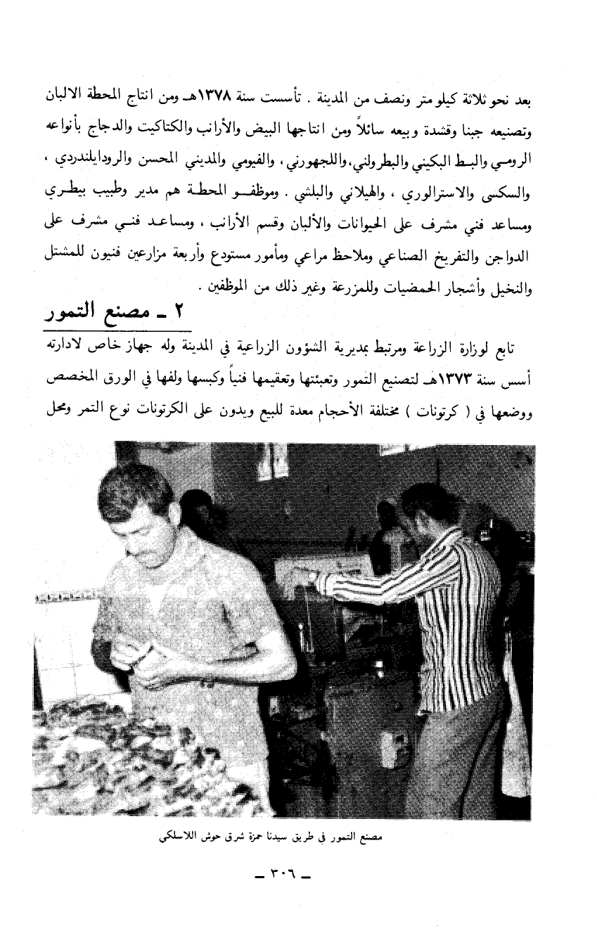 2 - مصنع التمور تابع لوزارة الزراعة ومرتبط بمديرية الشؤون الزراعية في المدينة وله جهاز خاص لادارته أسس سنة 1373هـ لتصنيع التمور وتعبئتها وتعقيمها فنياً وكبسها ولفها في الورق المخصص ووضعها في (كرتونات) مختلفة الأحجام معدة للبيع ويدون على الكرتونات نوع التمر ومحل مصنع التمور في طريق سيدنا حمزة شرق حوش اللاسلكي…