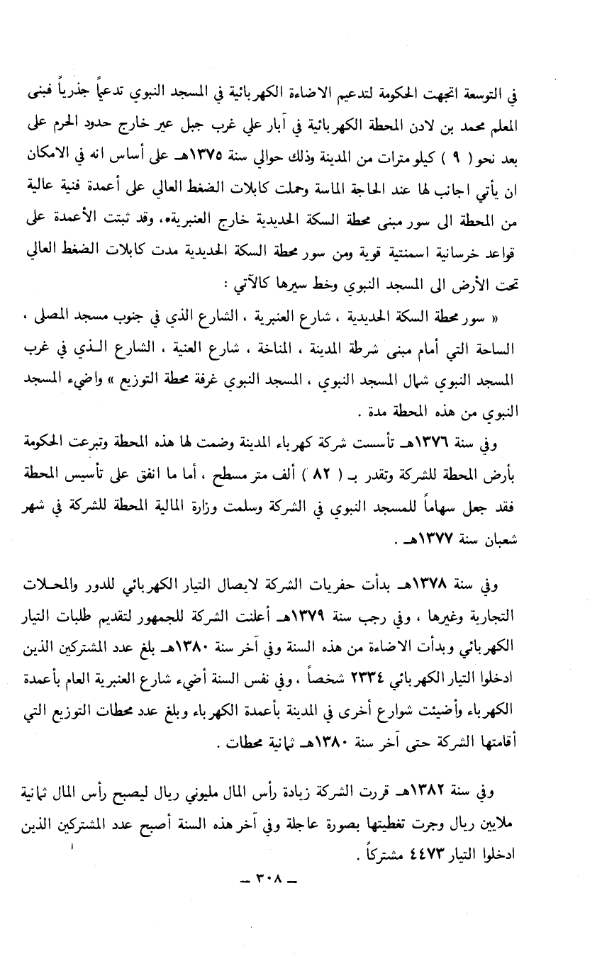 في التوسعة اتجهت الحكومة لتدعيم الاضاءة الكهربائية في المسجد النبوي تدعيماً جذرياً فبنى المعلم محمد بن لادن المحطة الكهربائية في آبار علي غرب جبل عير خارج حدود الحرم على بعد نحو (9) كيلو مترات من المدينة وذلك حوالي سنة 1375هـ على أساس أنه في الإمكان أن يأتي أجانب لها عند الحاجة الماسة وحملت كابلات الضغط العالي على أعمدة فنية عالية من المحطة إلى سور مبنى محطة السكة الحديدية خارج العنبرية، وقد ثبتت الأعمدة على قواعد خرسانية اسمنتية قوية ومن سور محطة السكة الحديدية مدت كابلات الضغط العالي تحت الأرض إلى المسجد النبوي وخط سيرها كالآتي: "سورة محطة السكة الحديدية، شارع العنبرية، الشارع الذي في جنوب مسجد المصلى، الساحة التي أمام مبنى شرطة المدينة، المناخة، شارع العنية، الشارع الذي في غرب المسجد النبوي شمال المسجد النبوي، المسجد النبوي غرفة محطة التوزيع" واضيء المسجد النبوي من هذه المحطة مدة. وفي سنة 1376هـ تأسست شركة كهرباء المدينة وضمت لها هذه المحطة وتبرعت الحكومة بأرض المحطة للشركة وتقدر بـ (82) ألف متر مسطح، أما ما أنفق على تأسيس المحطة فقد جعل سهاماً للمسجد النبوي في الشركة وسلمت وزارة المالية المحطة للشركة في شهر شعبان سنة 1377هـ. وفي سنة 1378هـ بدأت حفريات الشركة لايصال التيار الكهربائي للدور والمحلات التجارية وغيرها، وفي رجب سنة 1379هـ أعلنت الشركة للجمهور لتقديم طلبات التيار الكهربائي وبدأت الاضاءة من هذه السنة وفي آخر سنة 1380هـ بلغ عدد المشتركين الذين ادخلوا التيار الكهربائي 2334 شخصاً، وفي نفس السنة أضيء شارع العنبرية العام بأعمدة الكهرباء وأضيئت شوارع أخرى في المدينة بأعمدة الكهرباء وبلغ عدد محطات التوزيع التي أقامتها الشركة حتى آخر سنة 1380هـ ثمانية محطات. وفي سنة 1382هـ قررت الشركة زيادة رأس المال مليوني ريال ليصبح رأس المال ثمانية ملايين ريال وجرت تغطيتها بصورة عاجلة وفي آخر هذه السنة أصبح عدد المشتركين الذين ادخلوا التيار 4473 مشتركاً.…